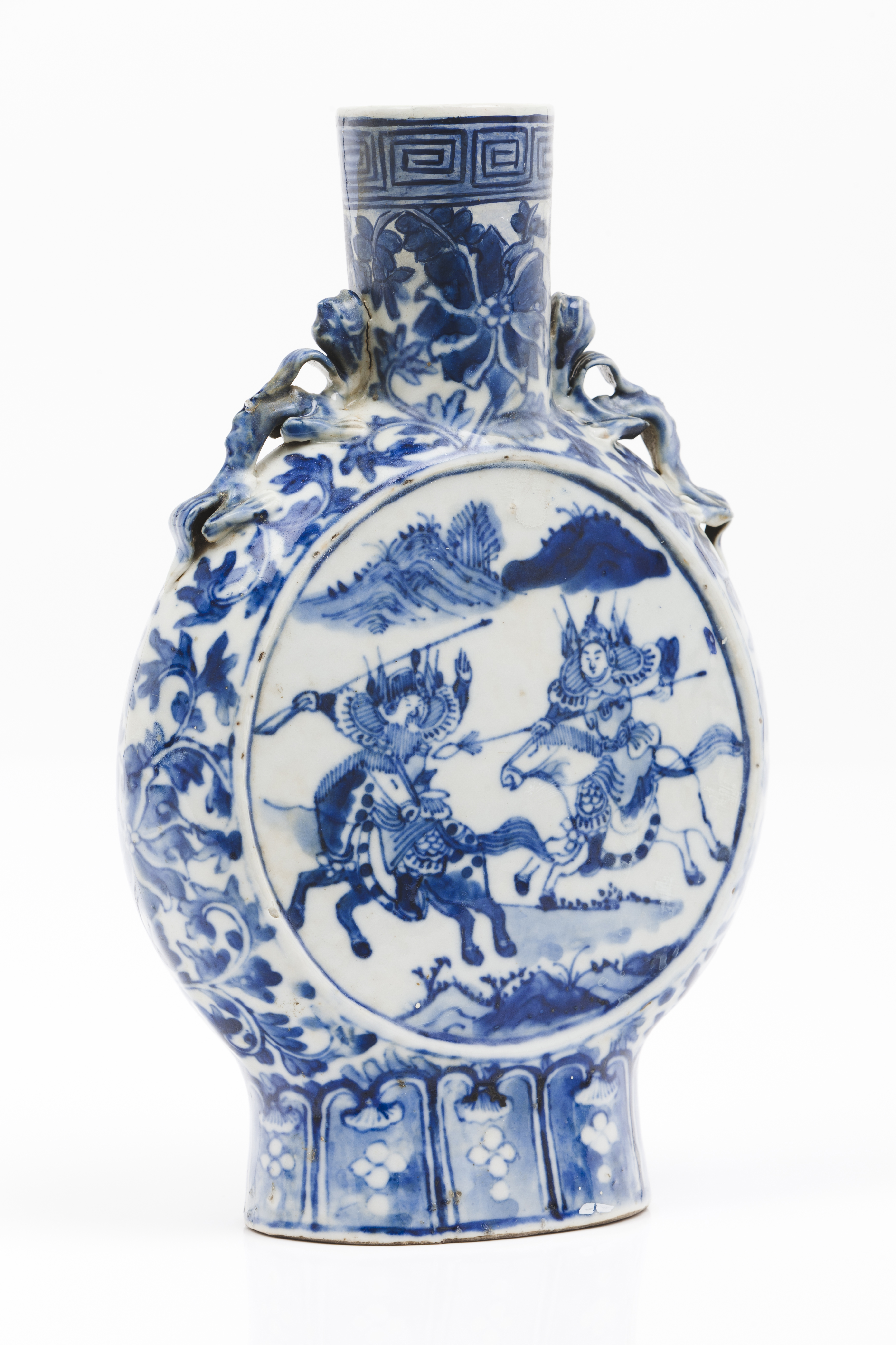 Flattened body of blue decoration with foliage elements and two cartouches featuring landscape with warriors