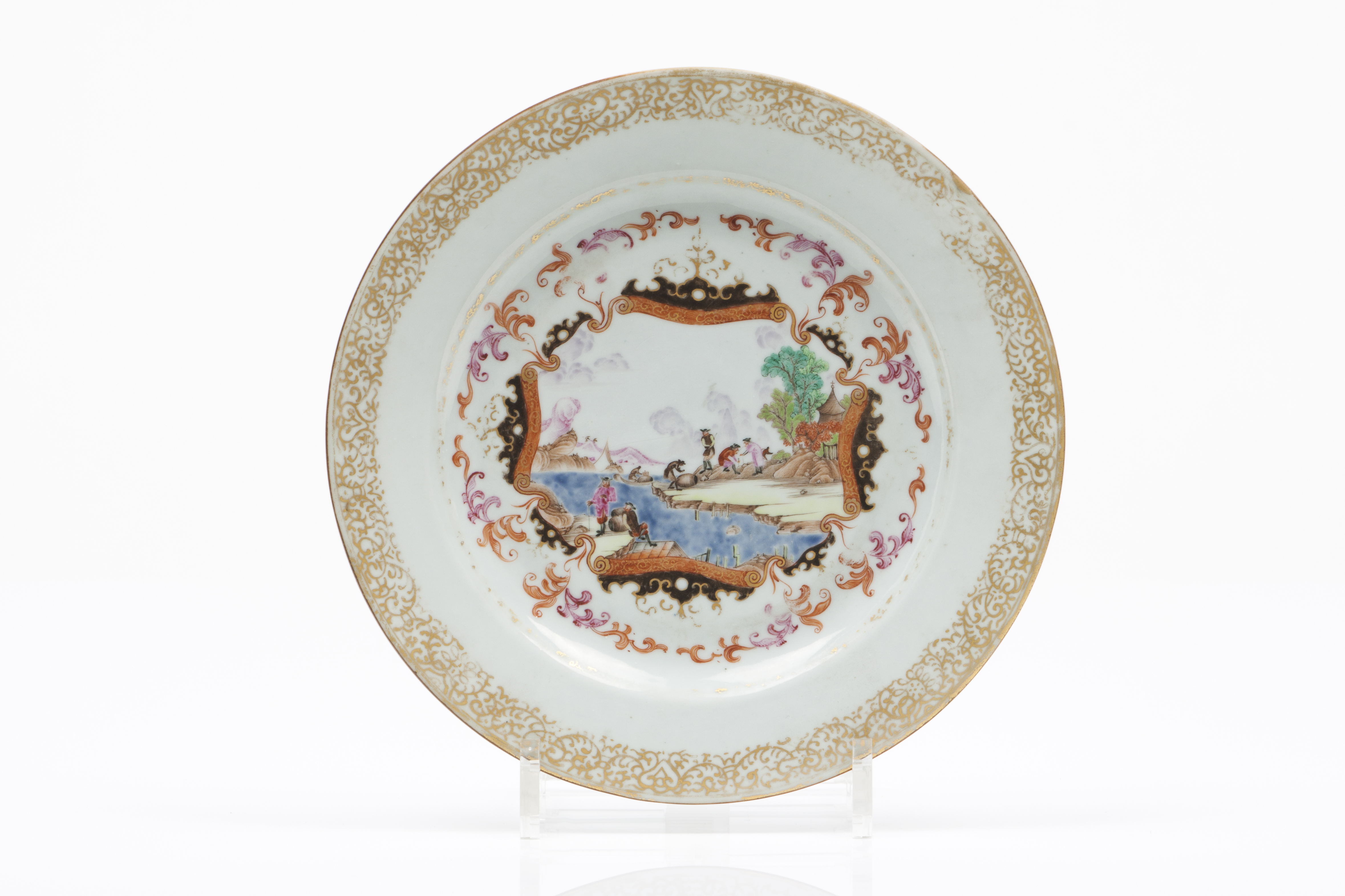 Chinese export porcelain, Polychrome Famille Rose decoration, rouge-de-fer and Meissen-style grisaille, depicting view of harbour with figures