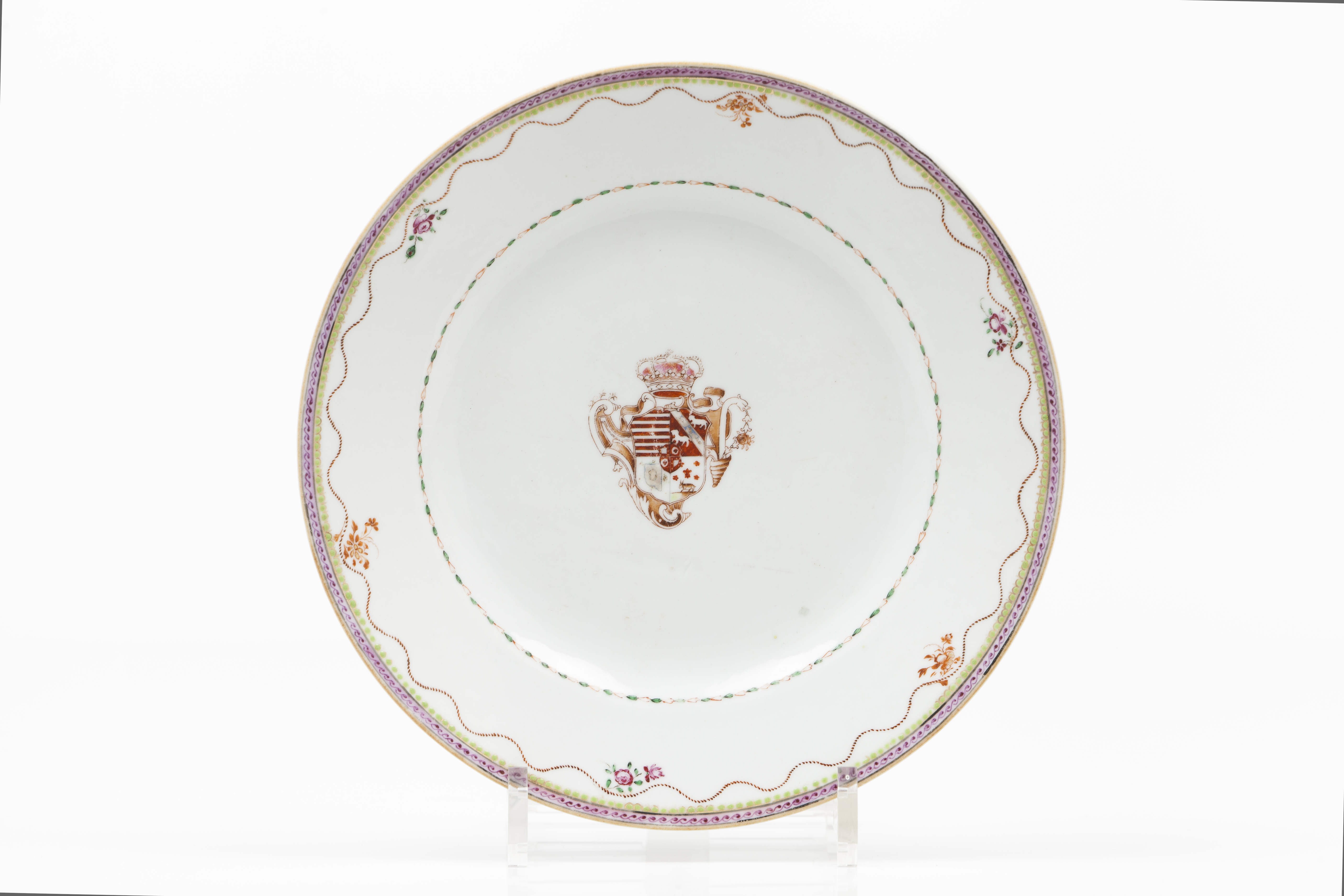 Polychrome and gilt "Famille Rose" enamelled decoration with armorial shield for José Pamplona Carneiro Rangel Baldaia de Tovar