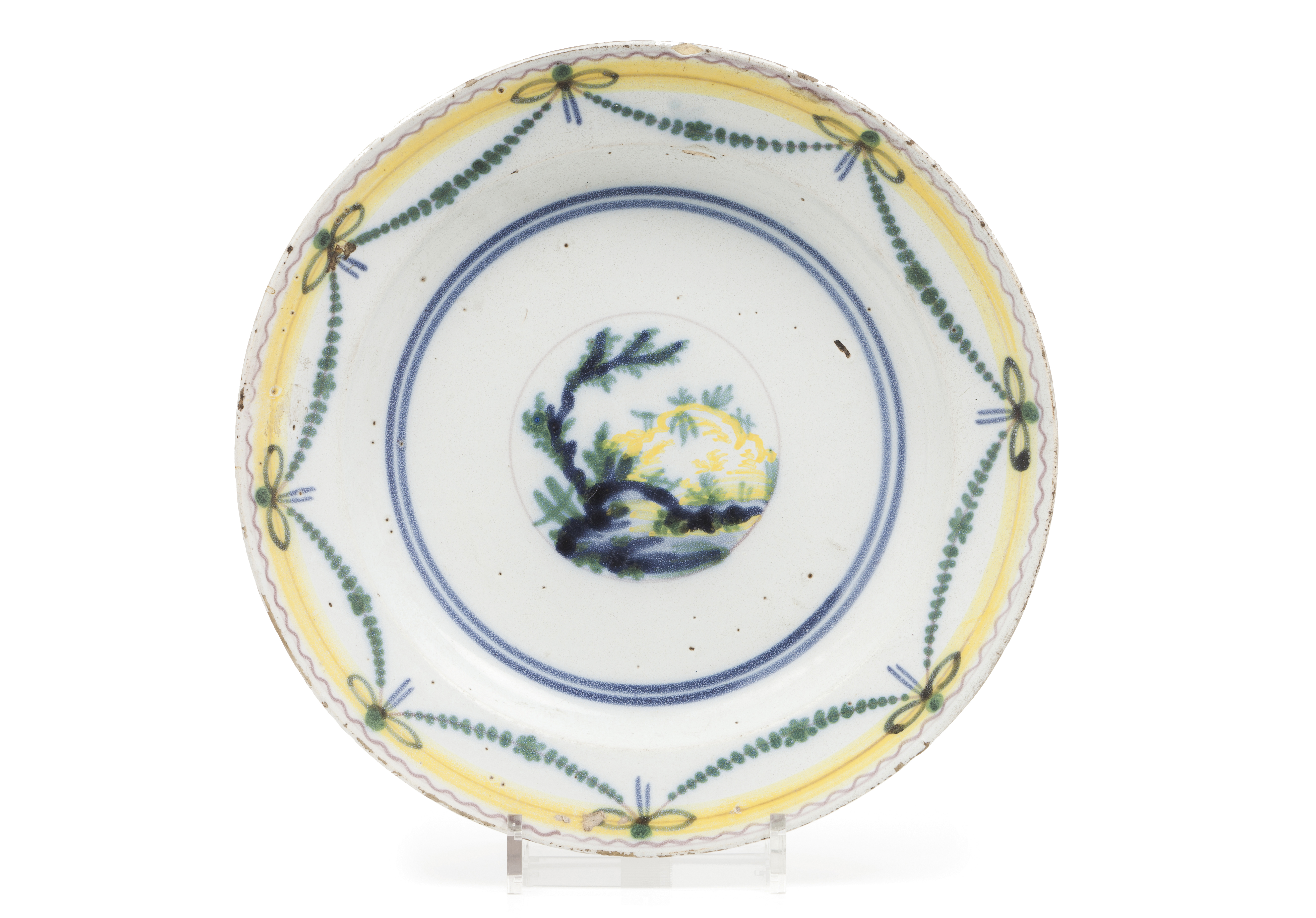 Green, blue and yellow decoration of central landscape cartouche and garlands to lip