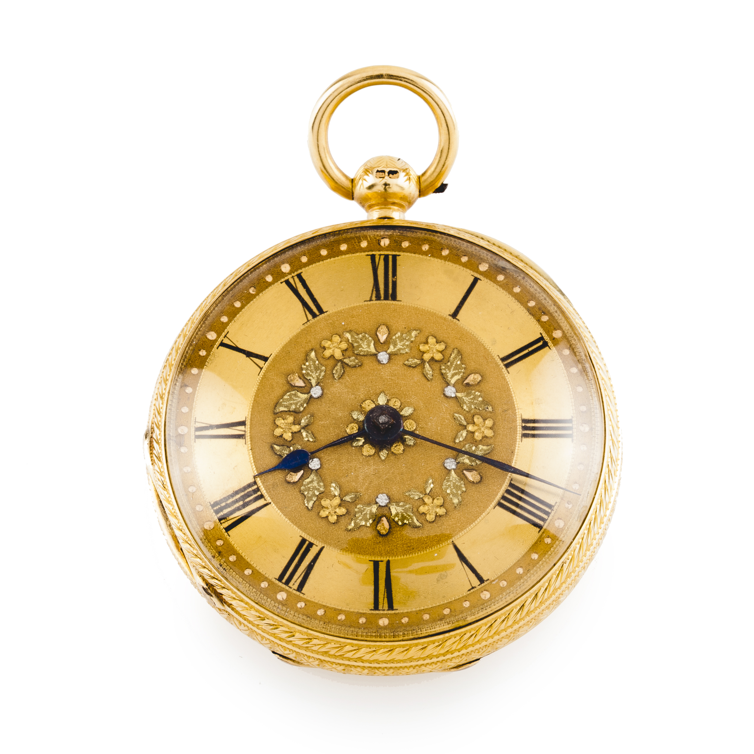 Gilt dial of Roman numbering with applied floral border