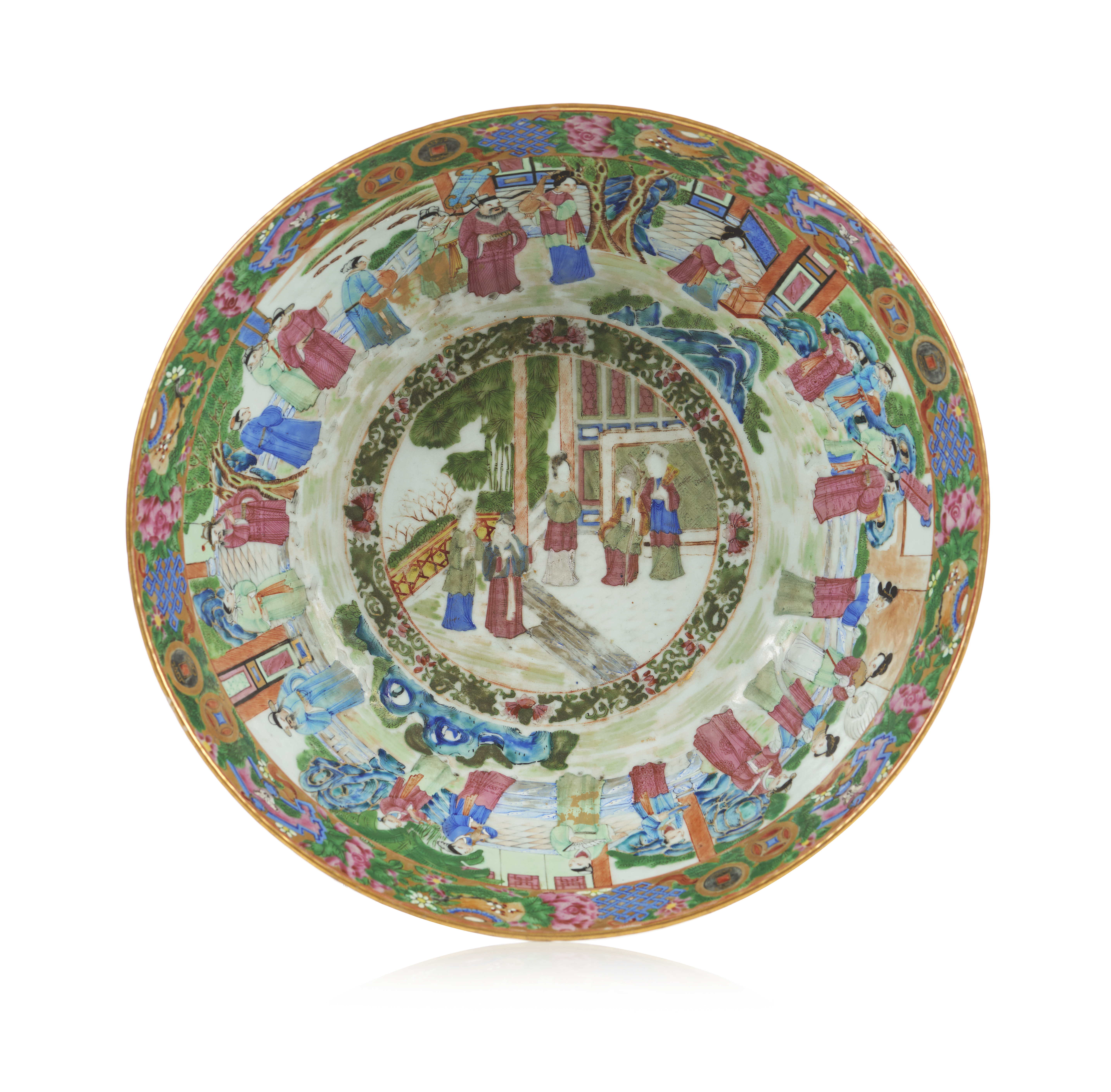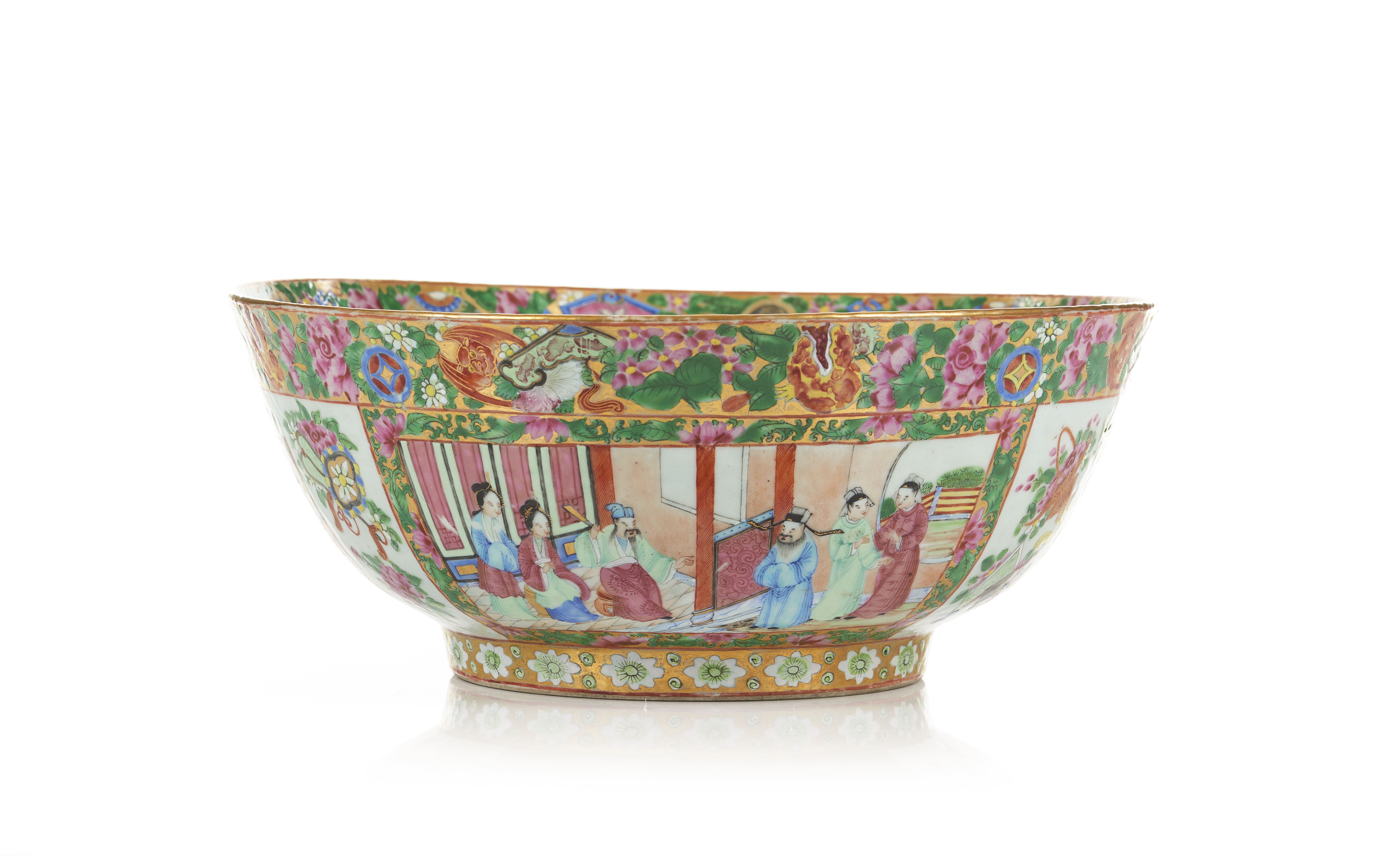 Polychrome "Famille Rose" enamelled decoration of landscapes with figures, precious objects, floral motifs and bats, said "Canton"