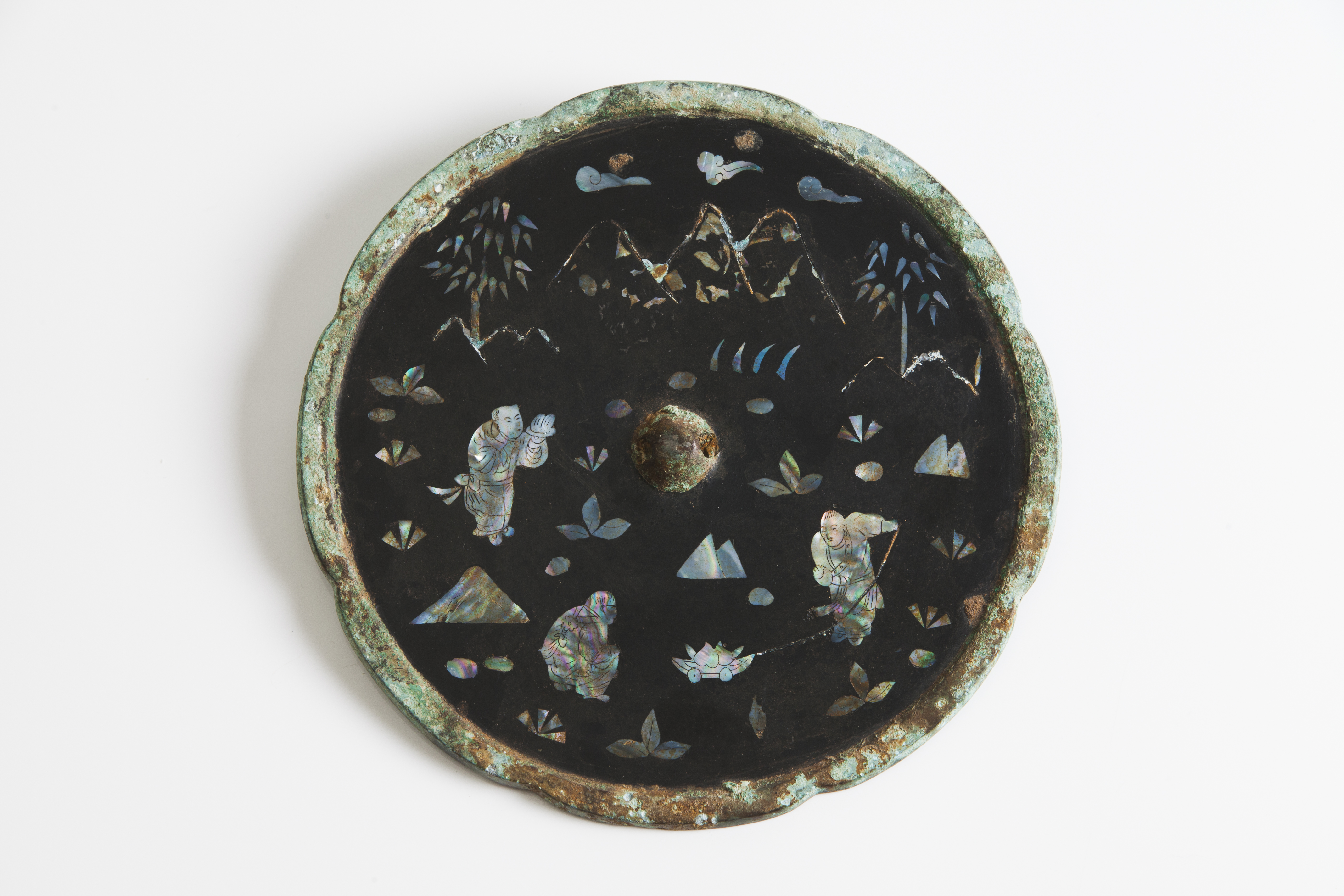 A rare bronze and mother-of-pearl lacquer inlaid mirror