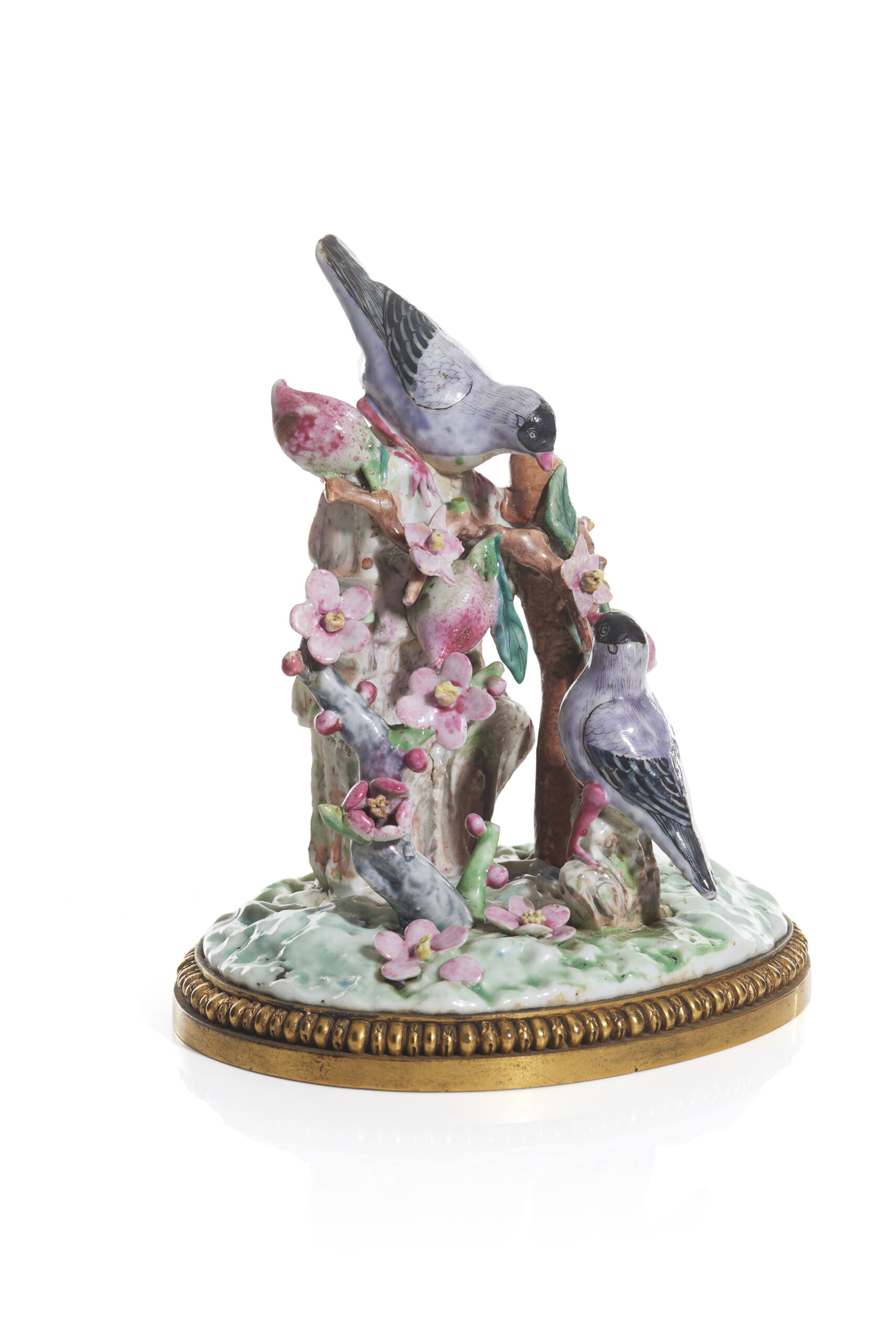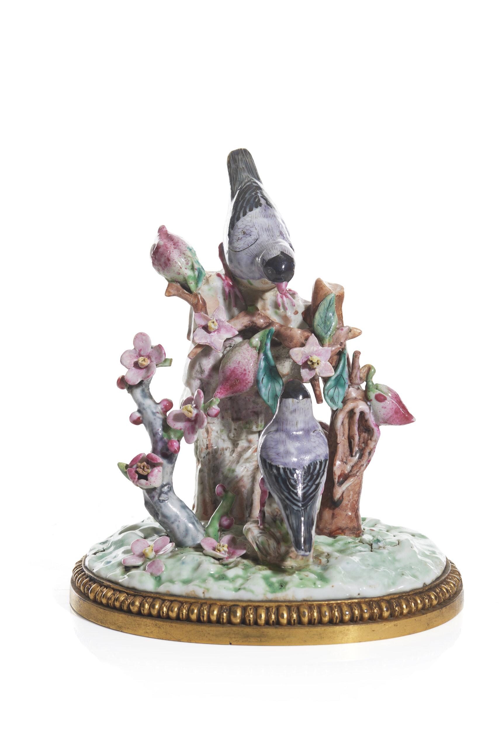 A rare Chinese export porcelain famille rose figural group of birds and flowers