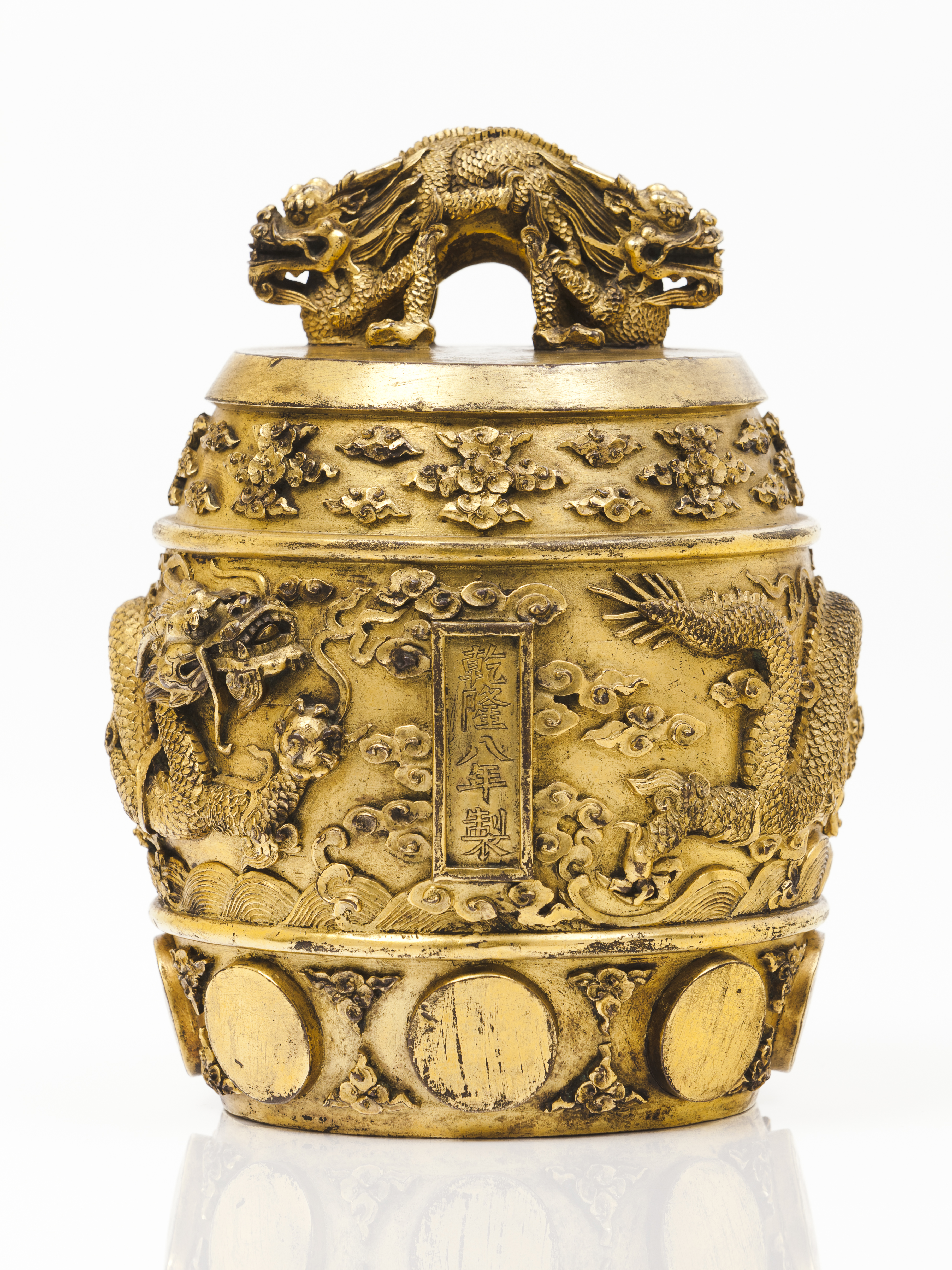 Central band depicting two five claw dragons holding pearl, while overflying waves amongst clouds and flames, with two inscribed rectangular cartouches identifying the musical note produced by the bell – “倍南吕” (beinanlu - low octave of the tenth note) – and dating it – “乾隆八年制” (made in the eight year of the Qianlong reign – 1743)