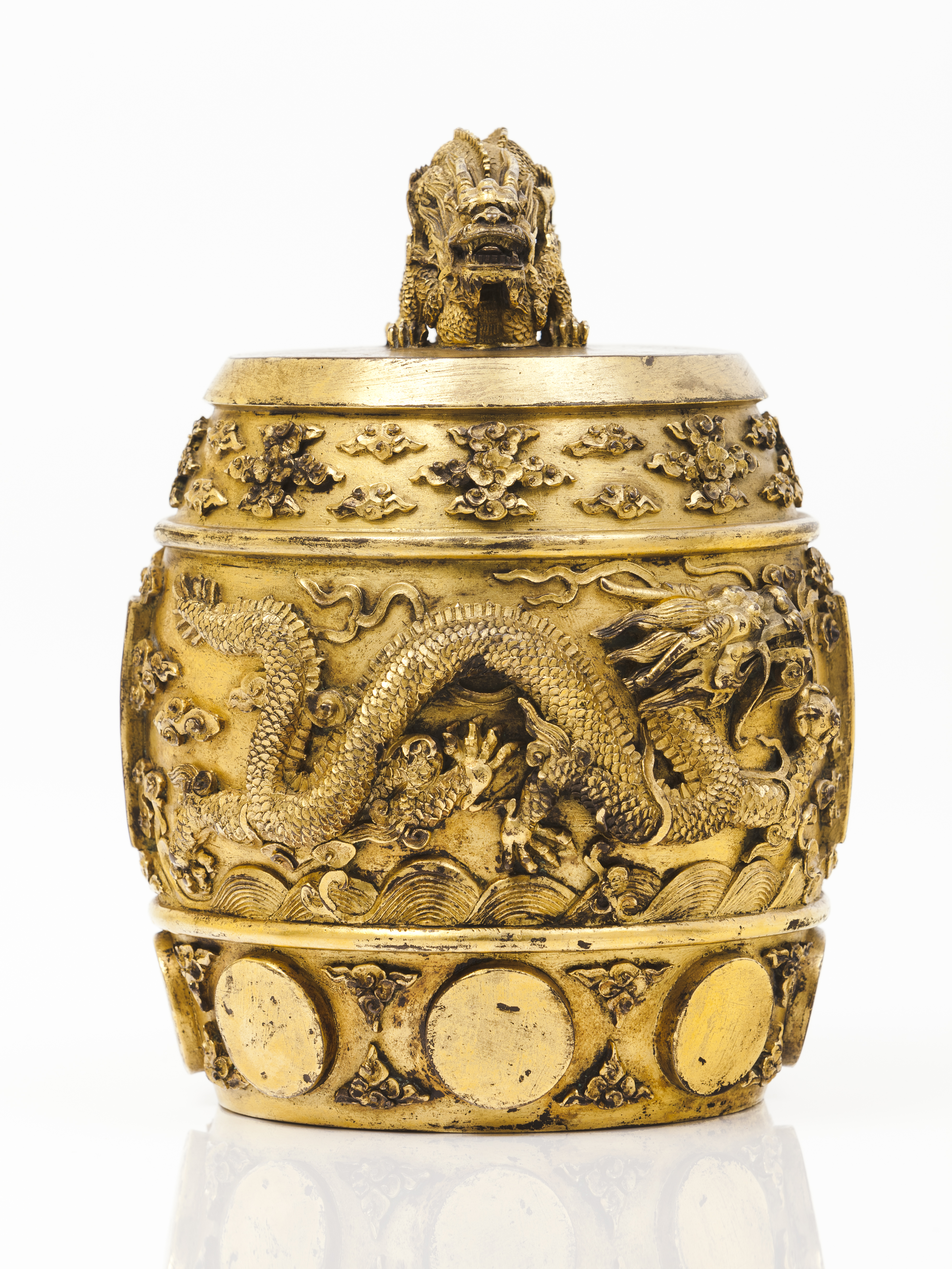 Upper band decorated with frieze of stylised clouds and lower band with clouds and eight medallions