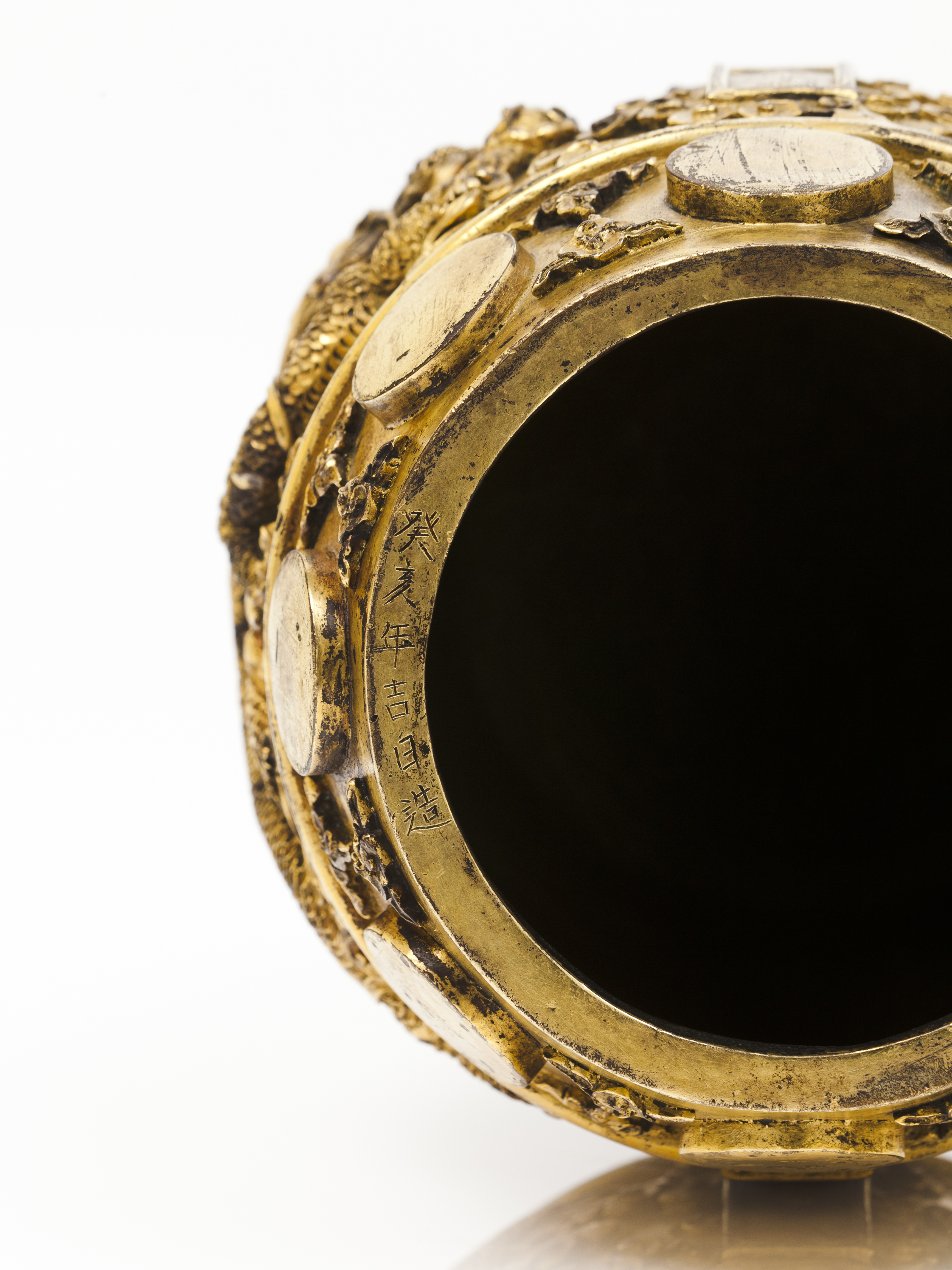 Cast in barrel shape with relief decoration