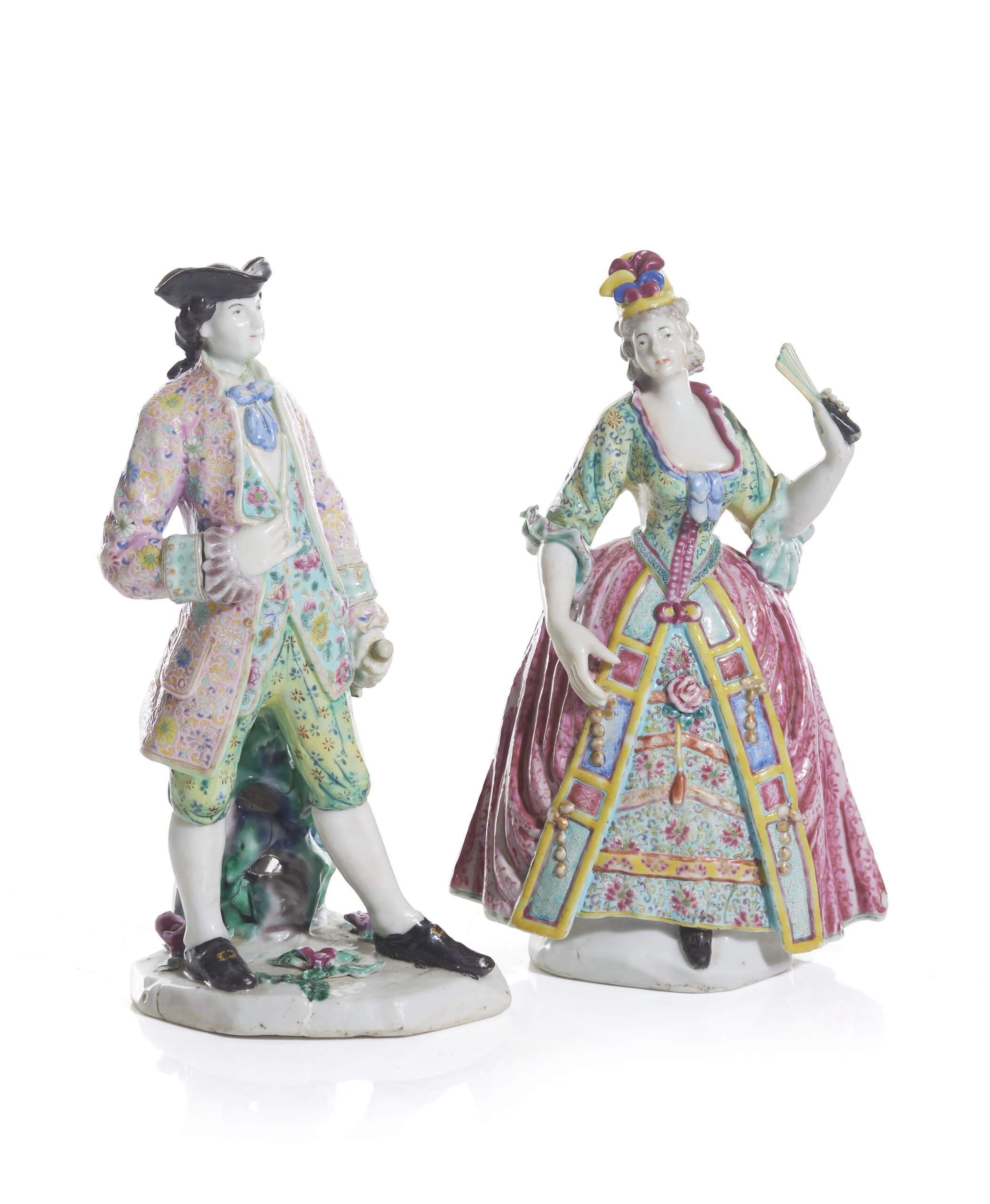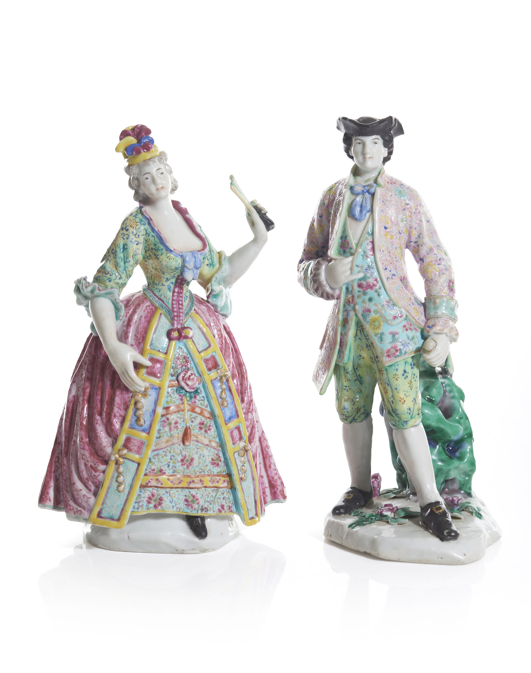 These figures are a rare example of Chinese export porcelain sculpture modelled after European prototypes, a typology of which very few examples are known. The representation of gallant figures in eighteenth-century dress, here modelled in the round, finds a parallel in the painted decoration of pieces from the same period, such as the polychrome dish with a gallant scene reproduced in M. Beurdeley, Porcelaine de la Compagnie des Indes, Paris, pp. 140–141. For a comparable sculptural group in Famille Rose porcelain, modelled after a Meissen original representing the so-called Tyrolean Dancers, cf. Cohen & Cohen: 50 Years of Chinese Export Porcelain, Bonhams, New York, 24 January 2023, lot 133 (est. US$20,000–30,000).