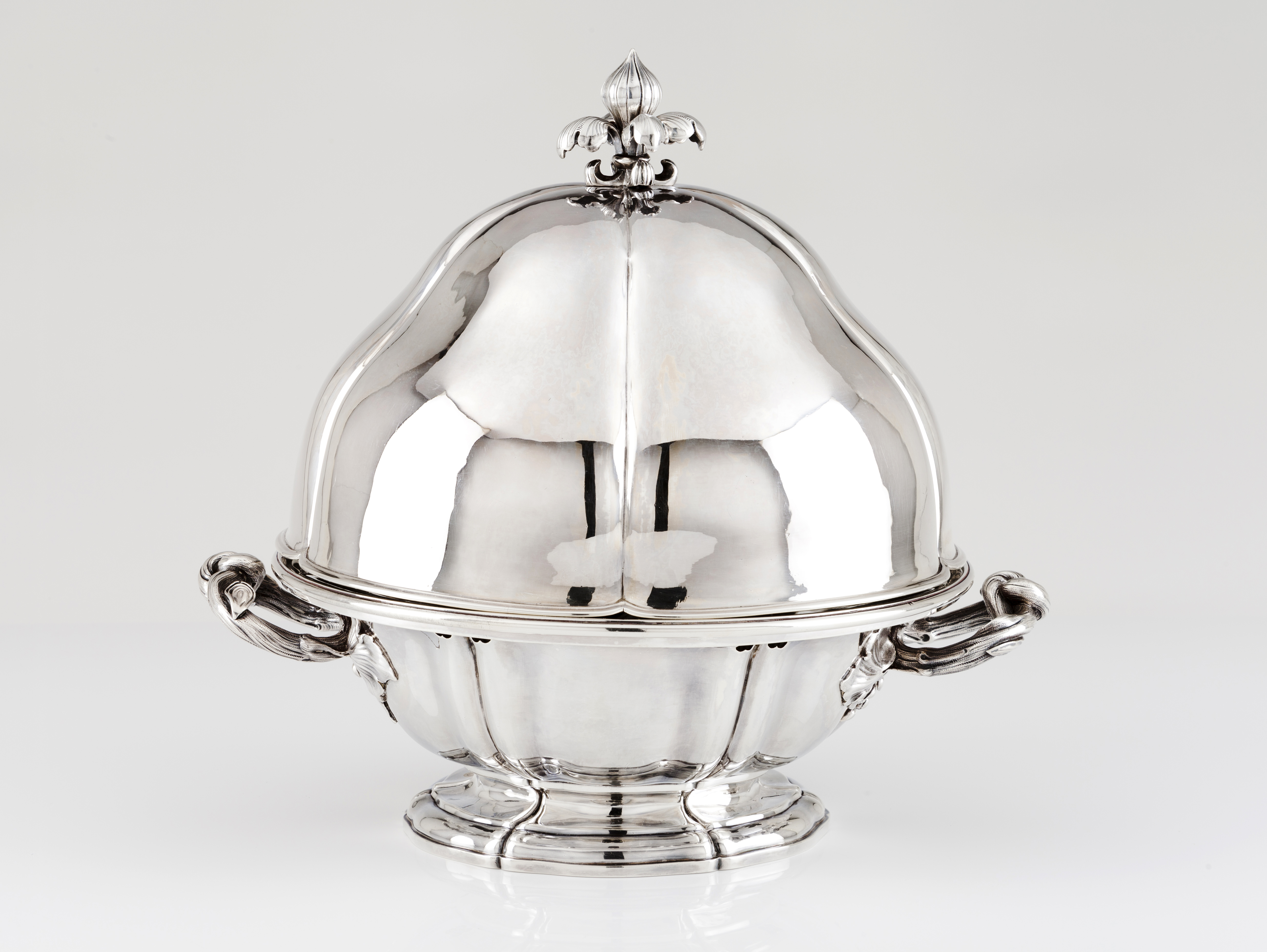 French silver, the lid surmounted by large fleur-de-lis. The pedestal with burner decorated with scalloped mouldings and handles of interlaced vine motifs with foliage and flower buds, marked "Minerve 1er Titre"