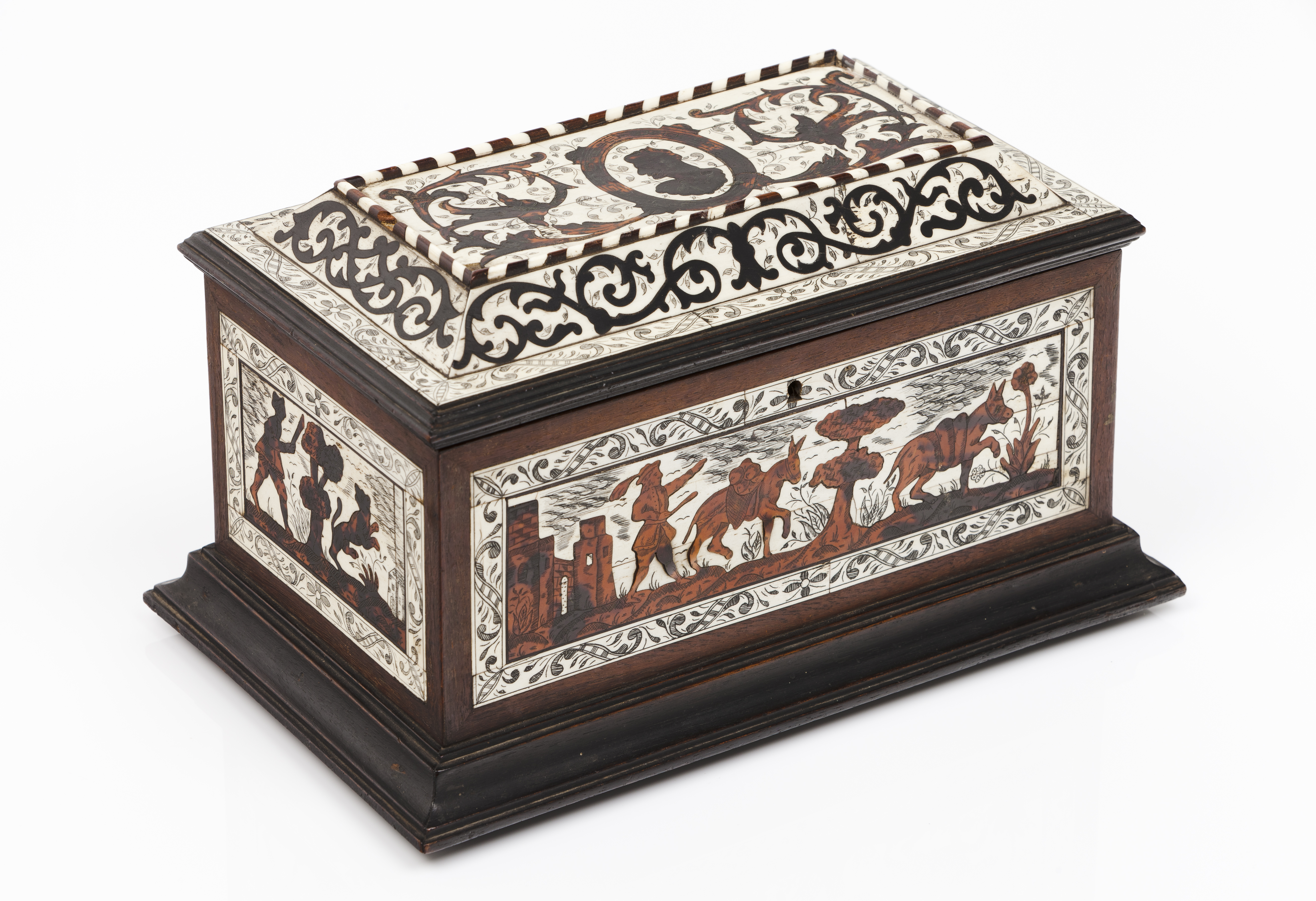 Tortoiseshell and ivory marquetry decoration of foliage motifs, bust medallion and landscape with figures and animals