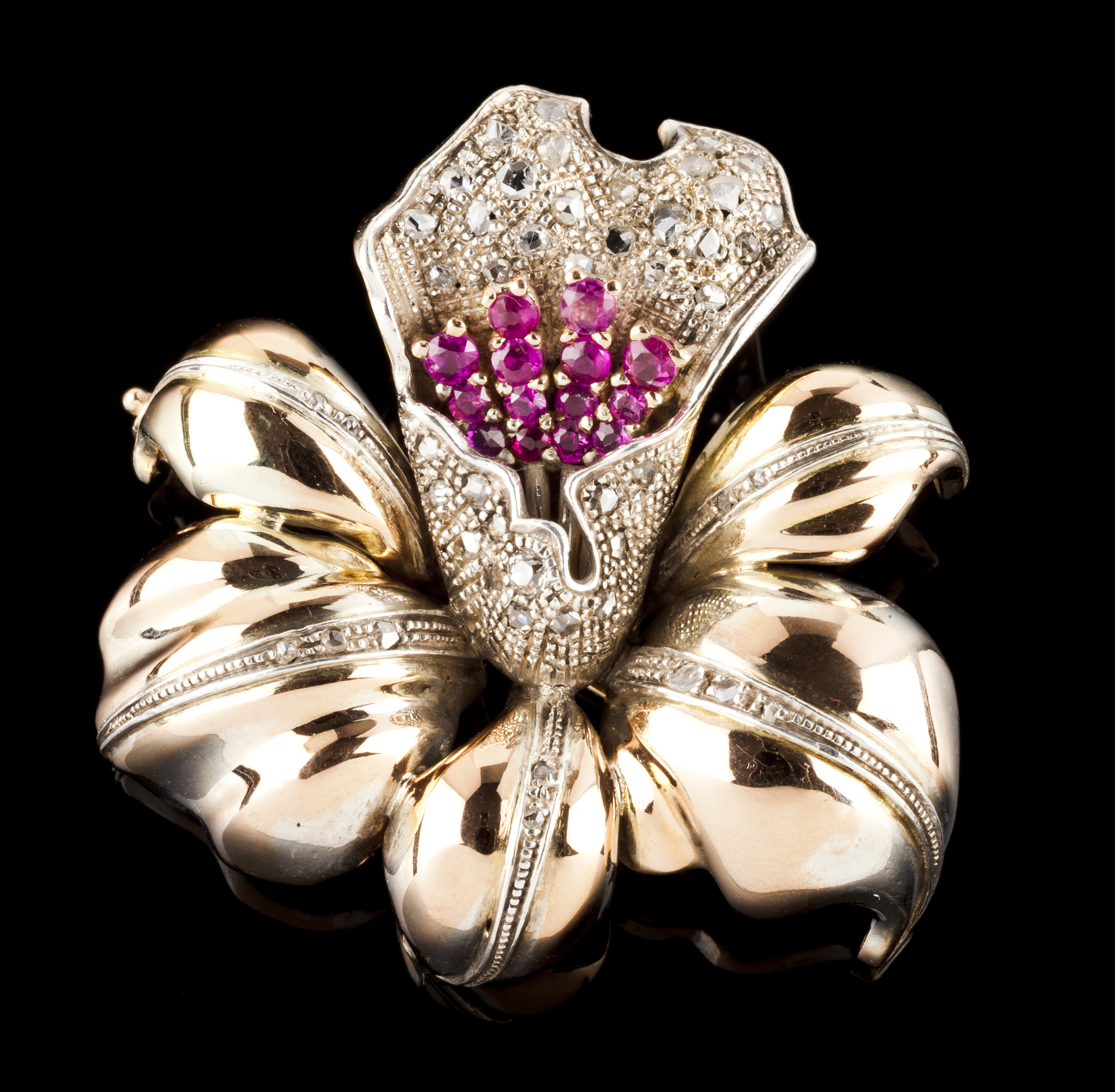 Designed as a flower set with synthetic rubies and rose cut diamonds
