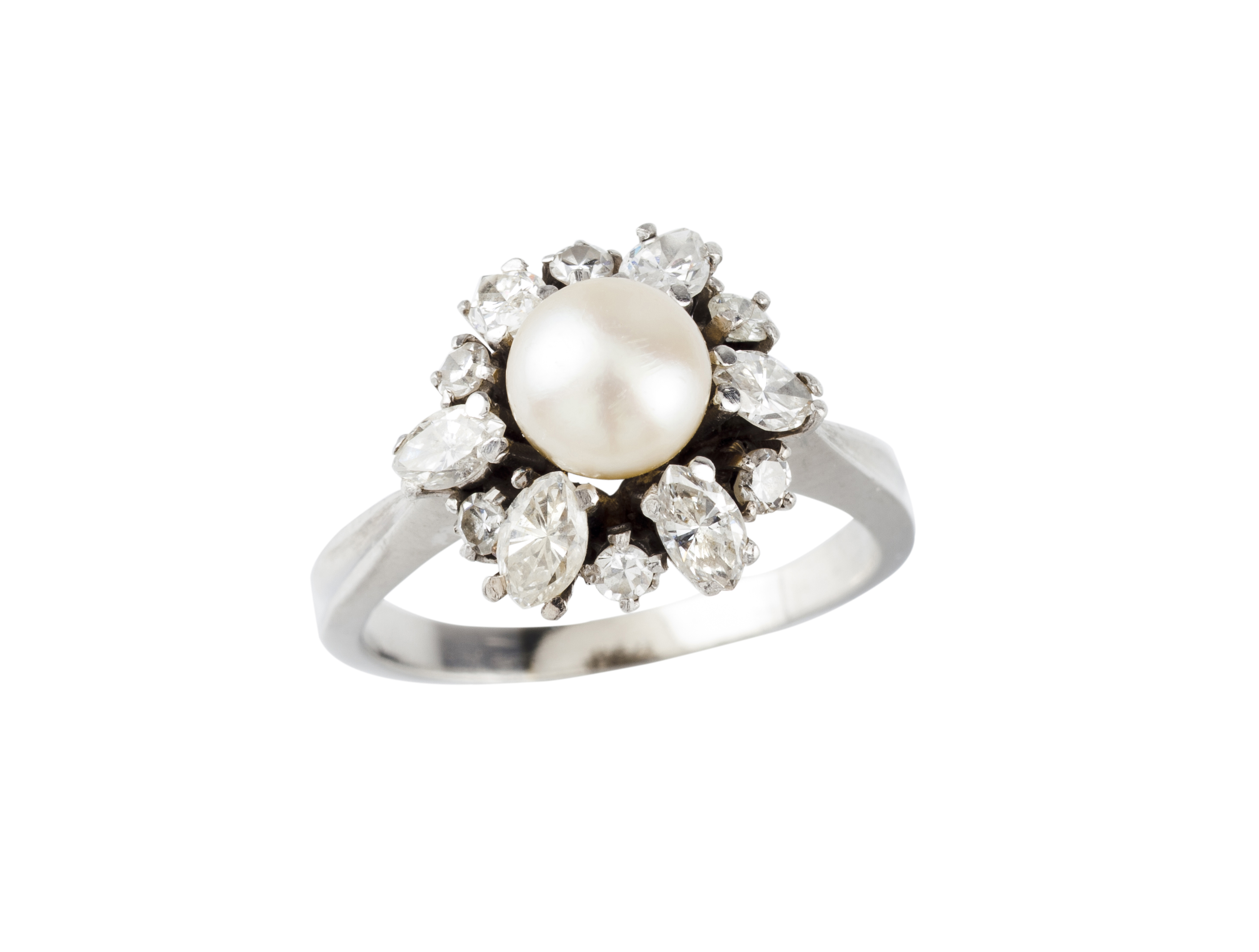 Set with one faux pearl (ca. 6 mm) 6 marquise cut diamonds (ca. 0.40ct) and 6 brilliant cut diamonds (one with chip)