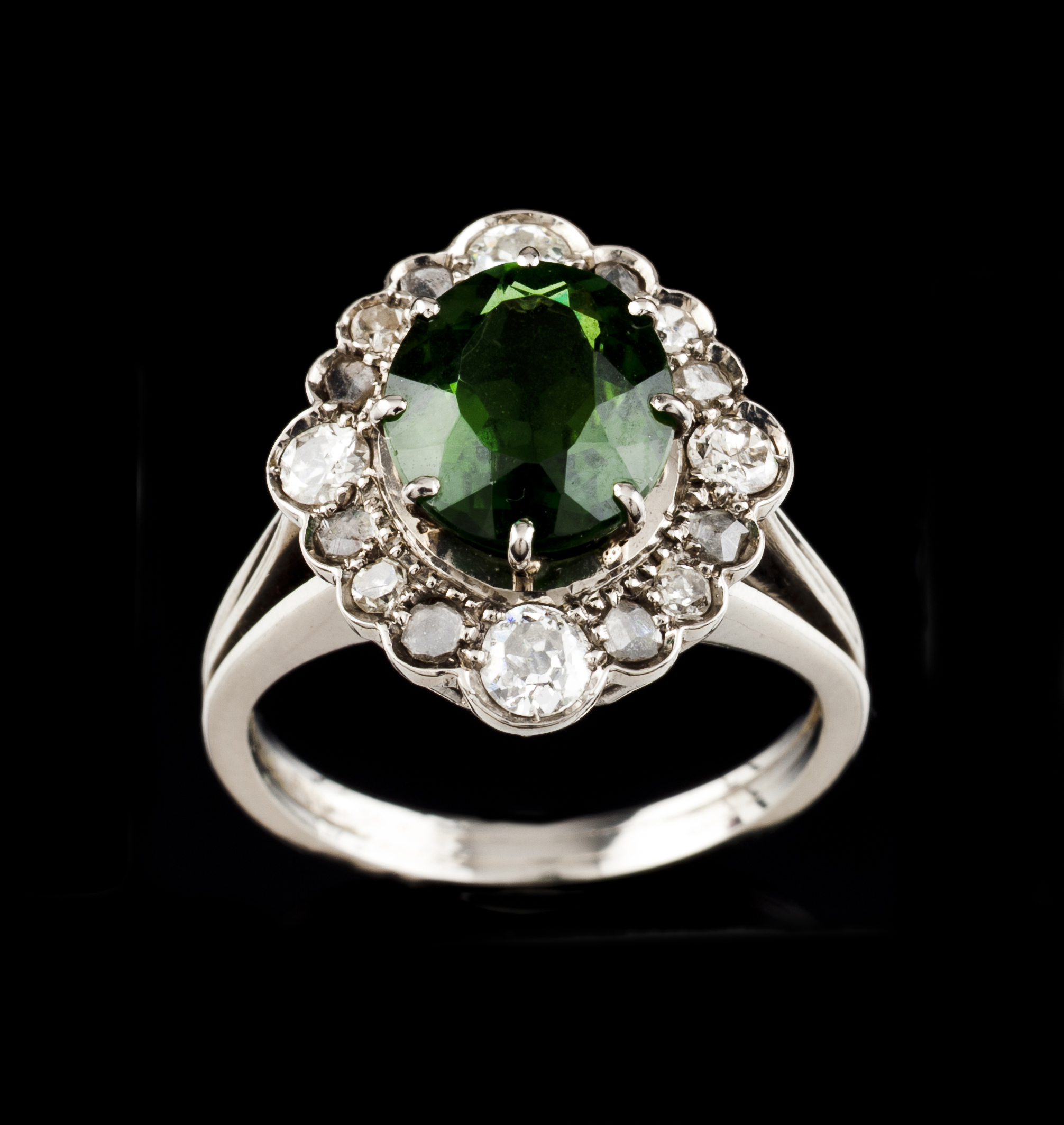 Set with green tourmaline, rose cut diamonds and 4 brilliant cut diamonds totalling approximately 0,80 ct.