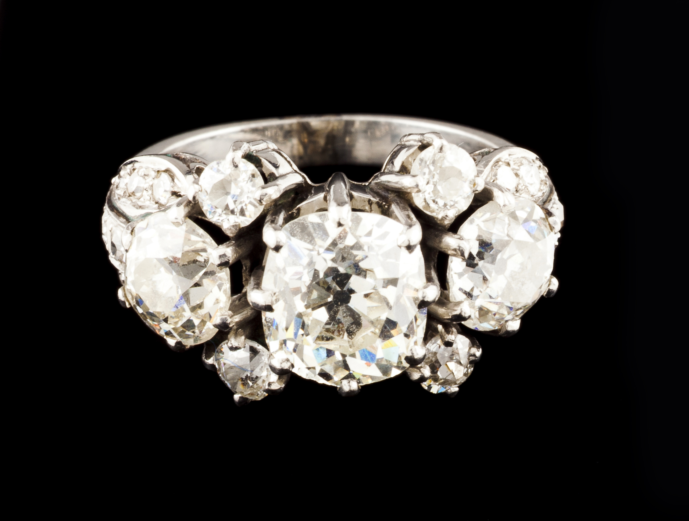 Set in platinum with 18 small single cut diamonds (ca. 0,15ct) and seven old mine cut diamonds (ca. 2,90cttw), the larger weighing approx. 1,40ct
