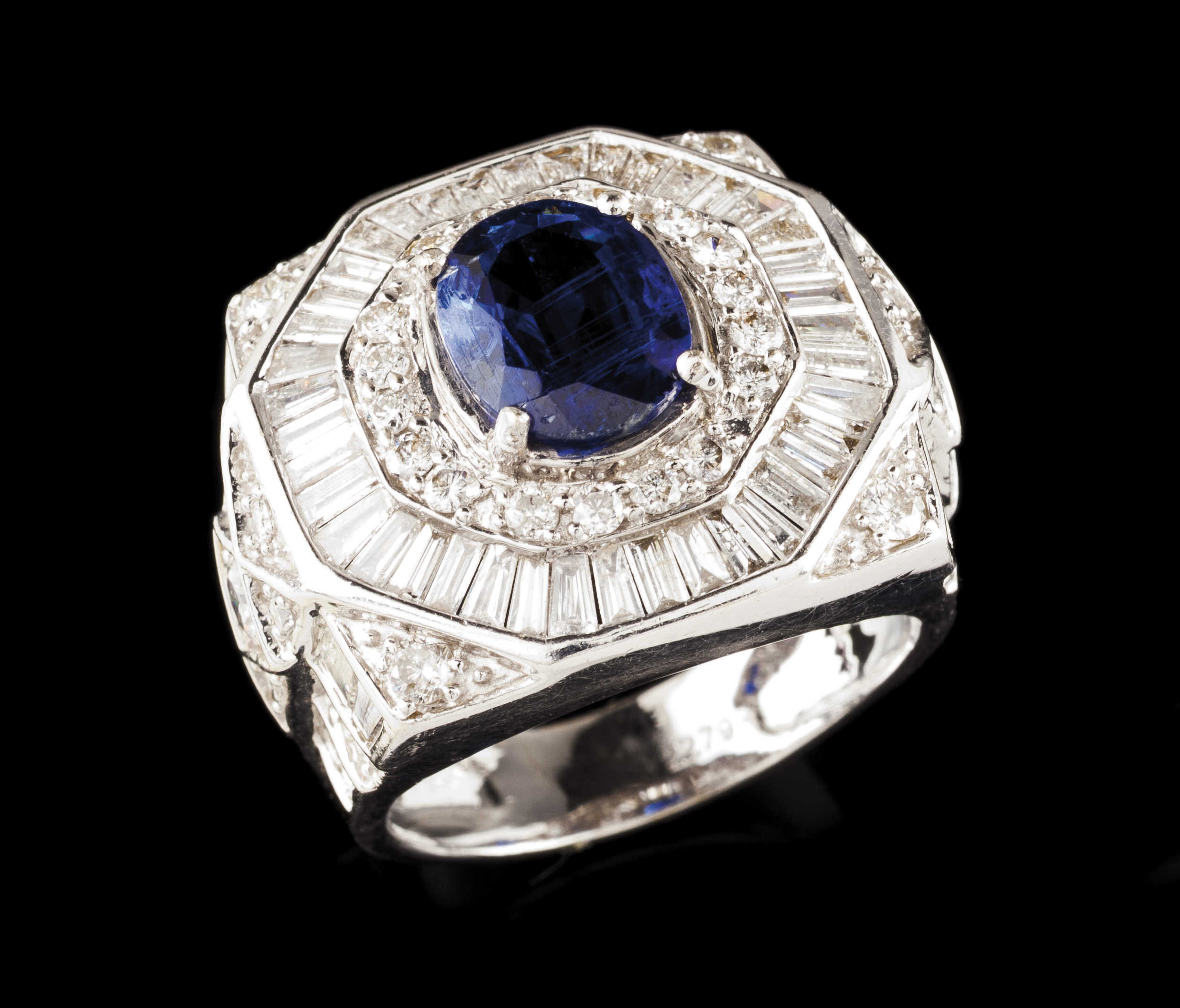 White gold set with one oval cut sapphire, 48 trapeze cut diamonds (ca. 1,40ct) and 44 brilliant cut diamonds (ca. 0,65ct)