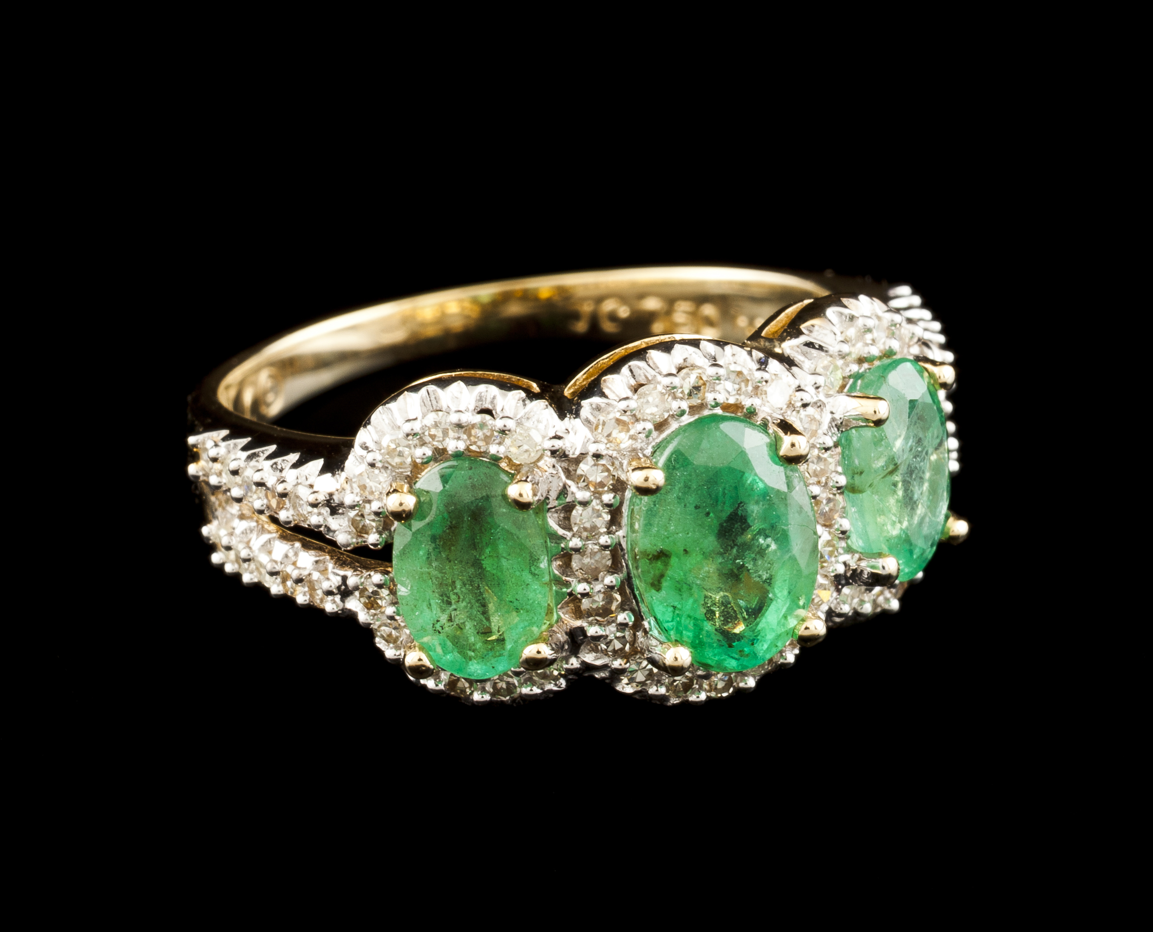 Set in 18kt gold with three oval cut emeralds and 55 small single cut diamonds