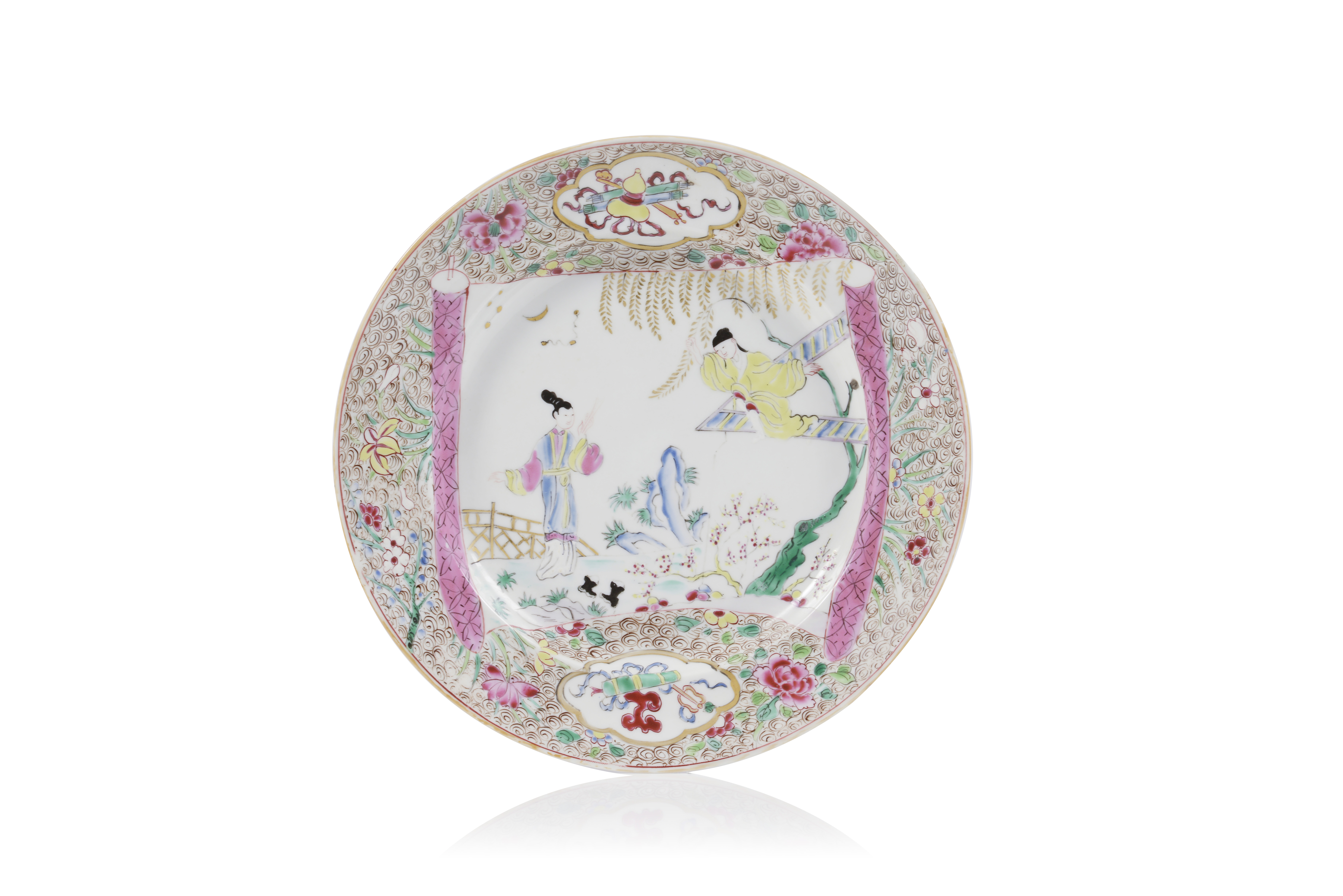 Polychrome "Famille Rose" enamelled decoration of central scroll with scene from the "Romance of the Western Chamber" (Xi Xiang Ji)