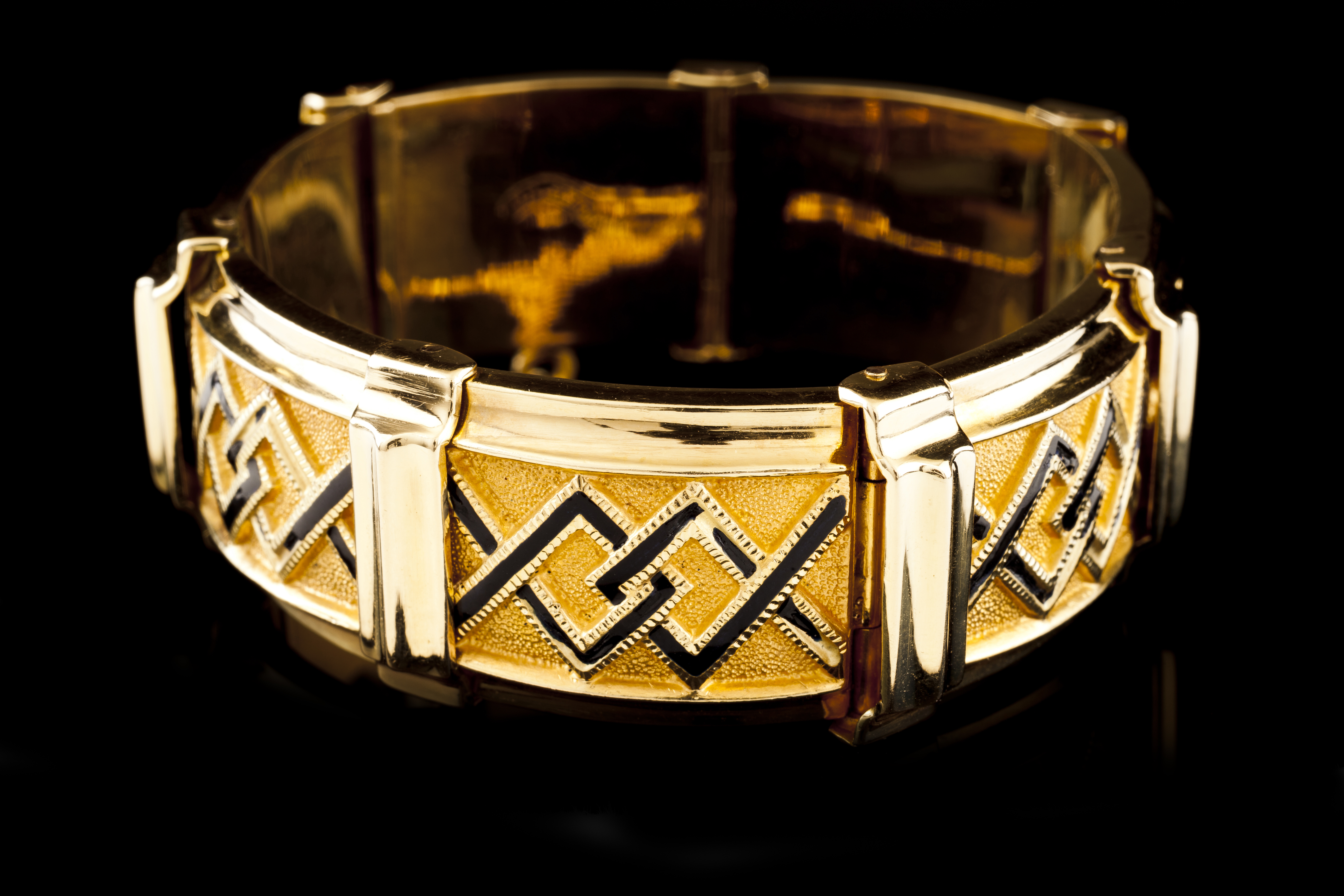 Textured decoration with geometric motifs in relief accented in black enamel