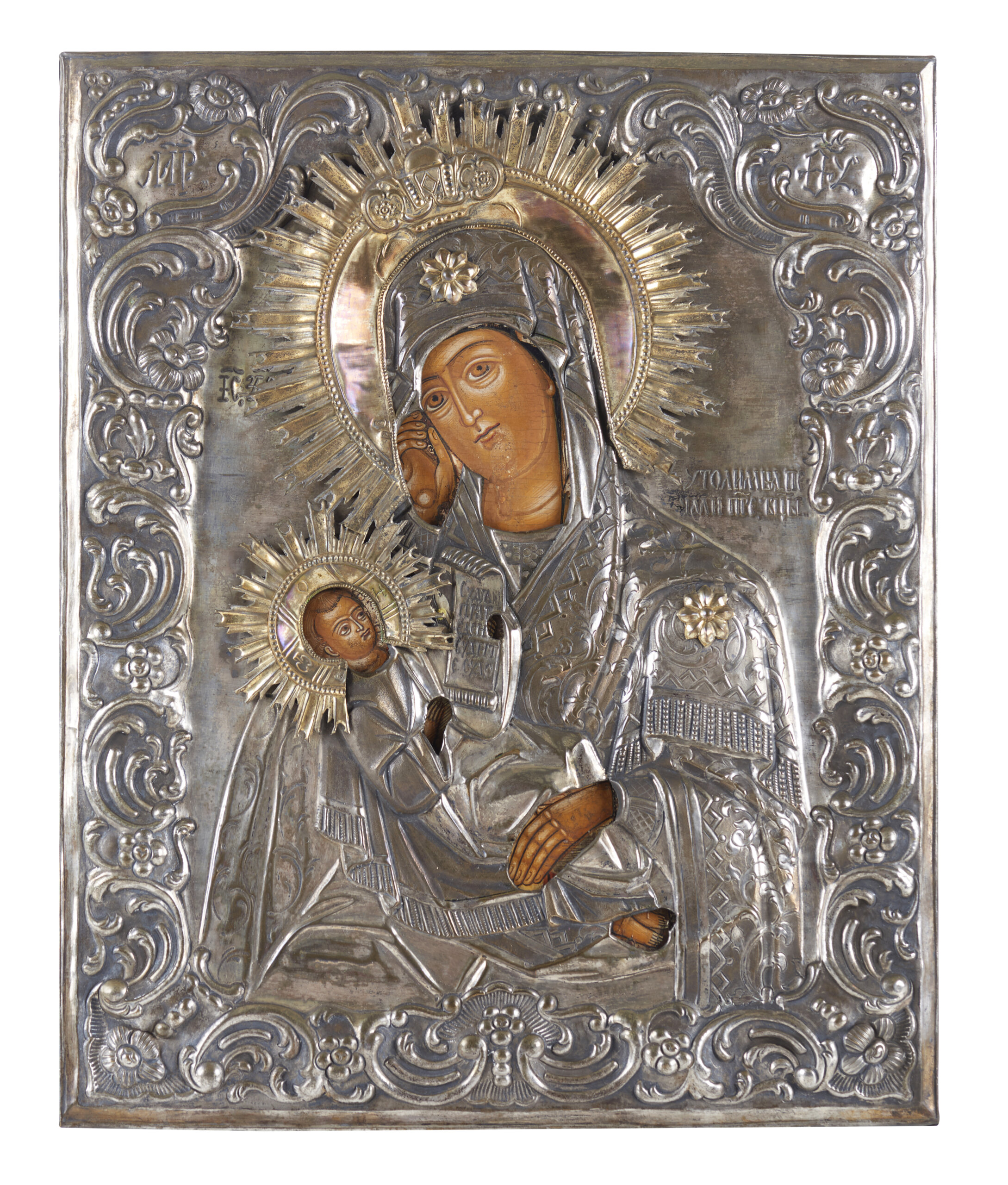 Covered with riza (oklad) in repoussé and chiseled silver, decorated with floral motifs, Cyrillic inscriptions, crown and rayed haloes