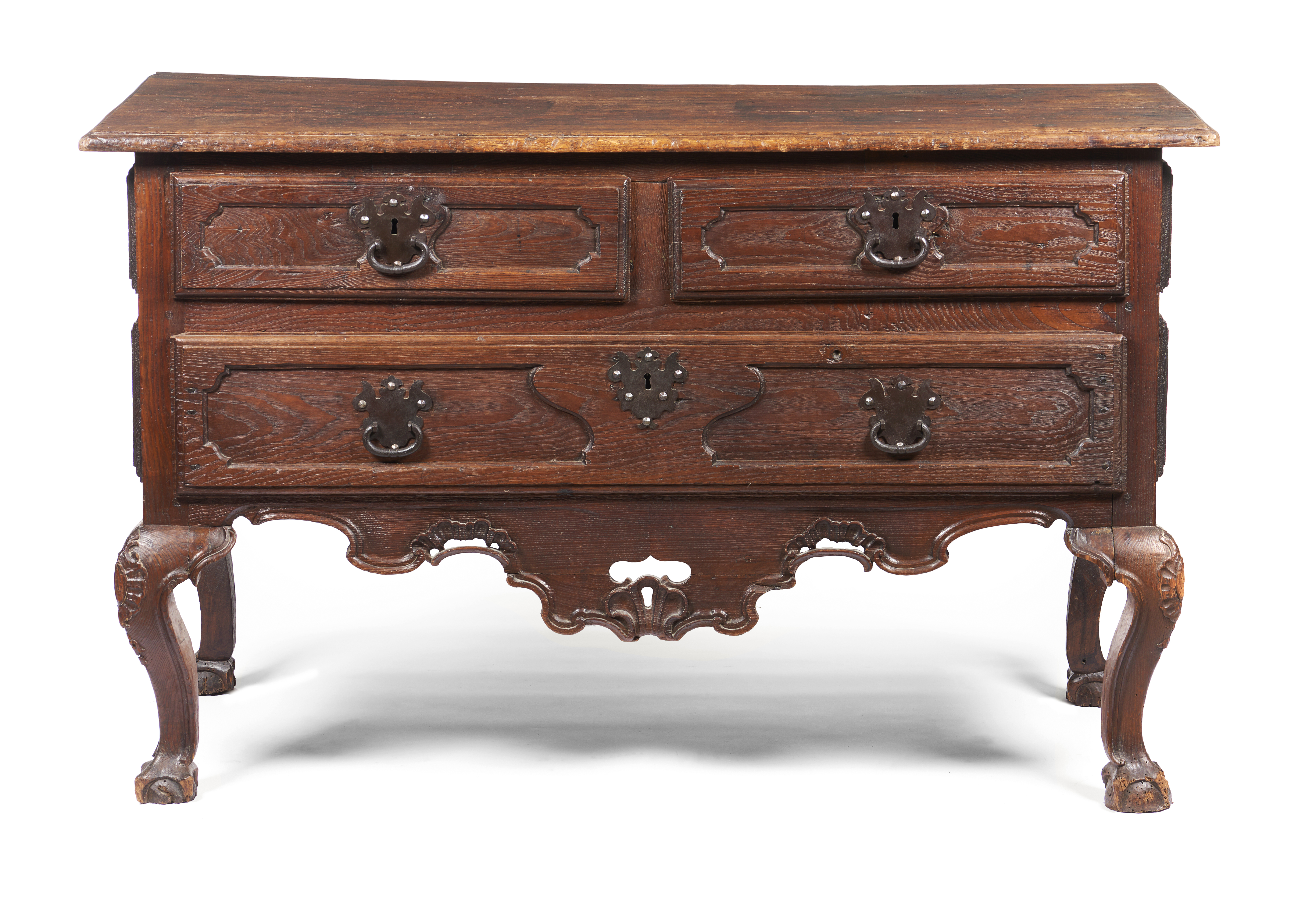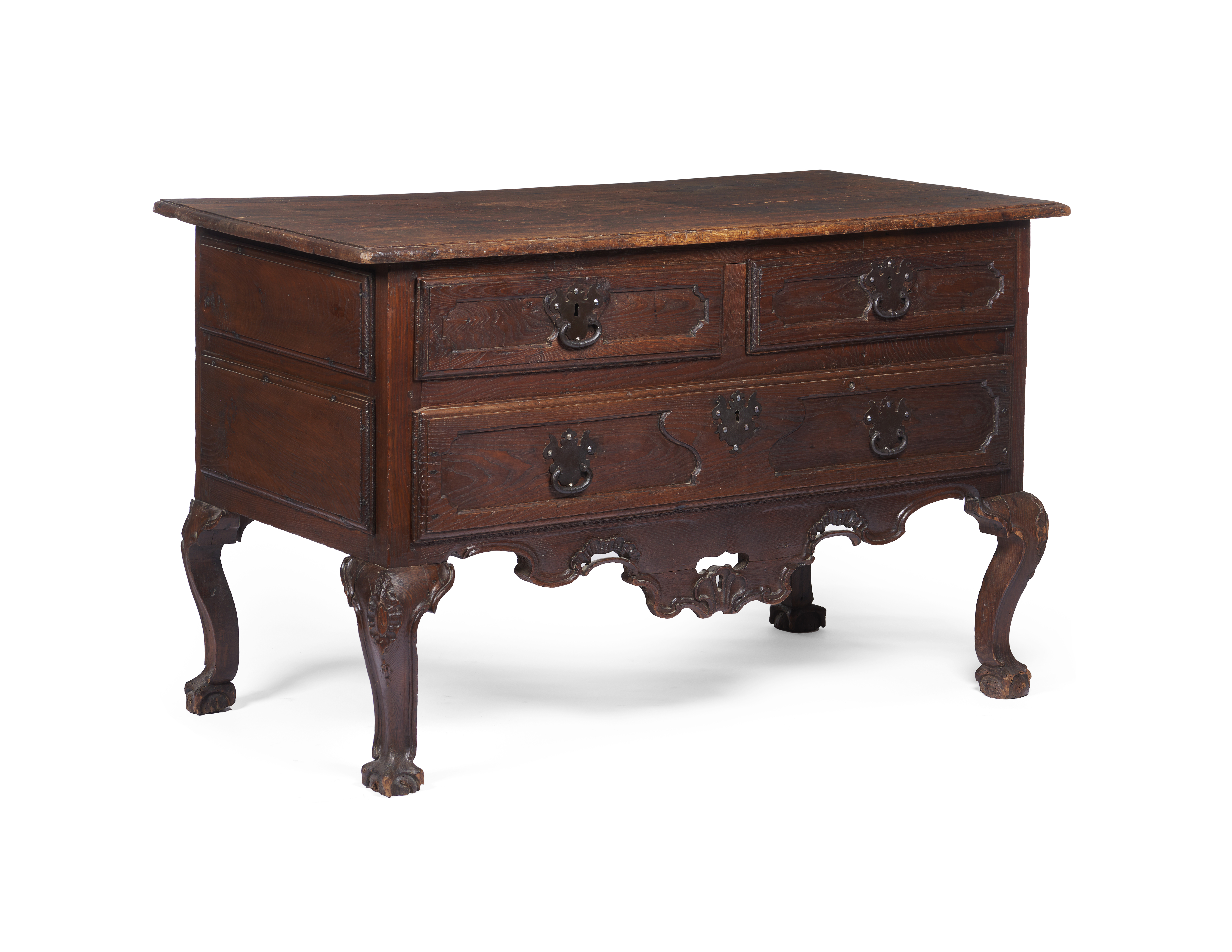 Featuring two small drawers and one large drawer, carved decorations, scalloped aprons, cabriole legs ending in claw-and-ball feet, and cast iron mounts