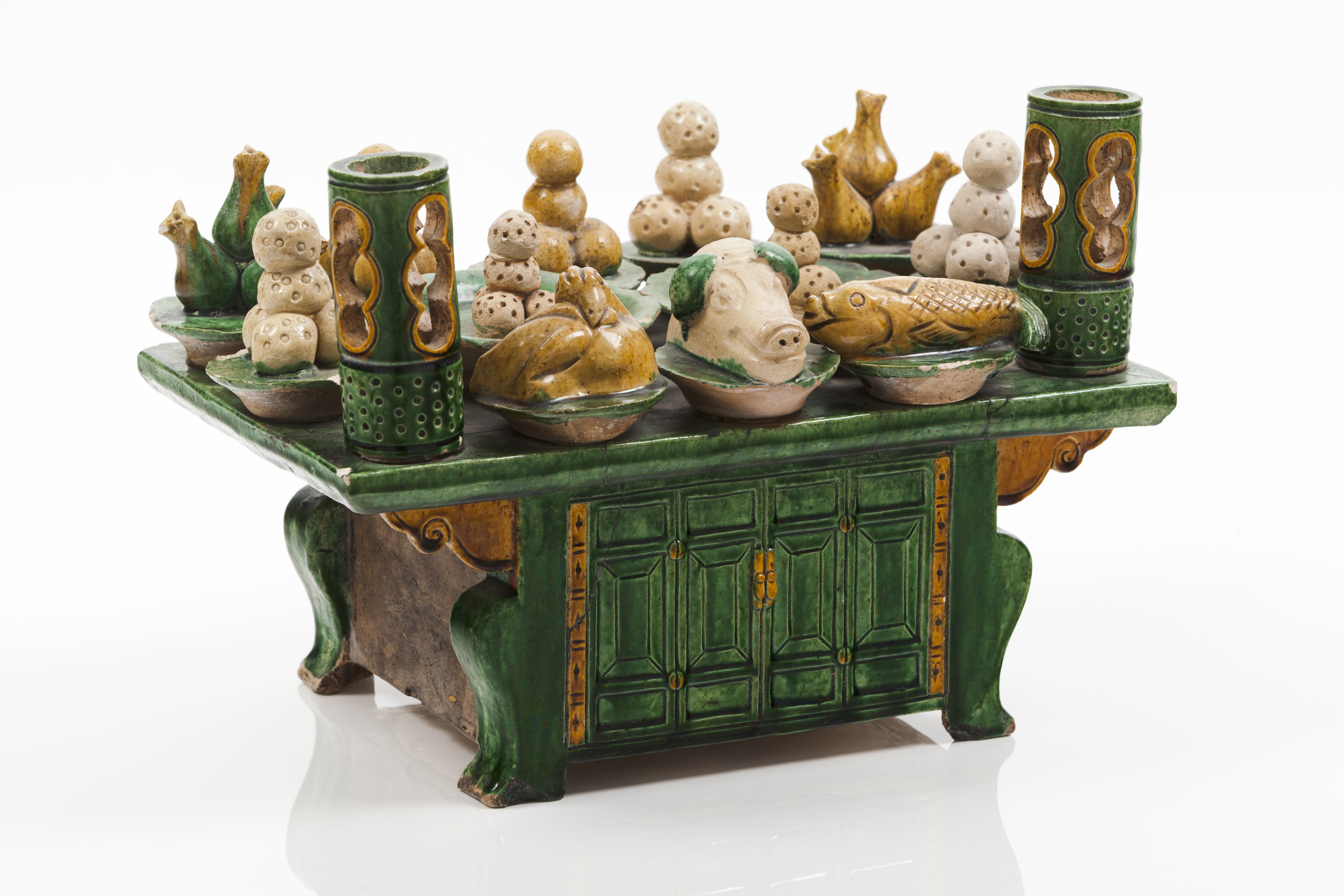 A SANCAI GLAZED MODEL OF AN ALTAR TABLE WITH OFFERINGS