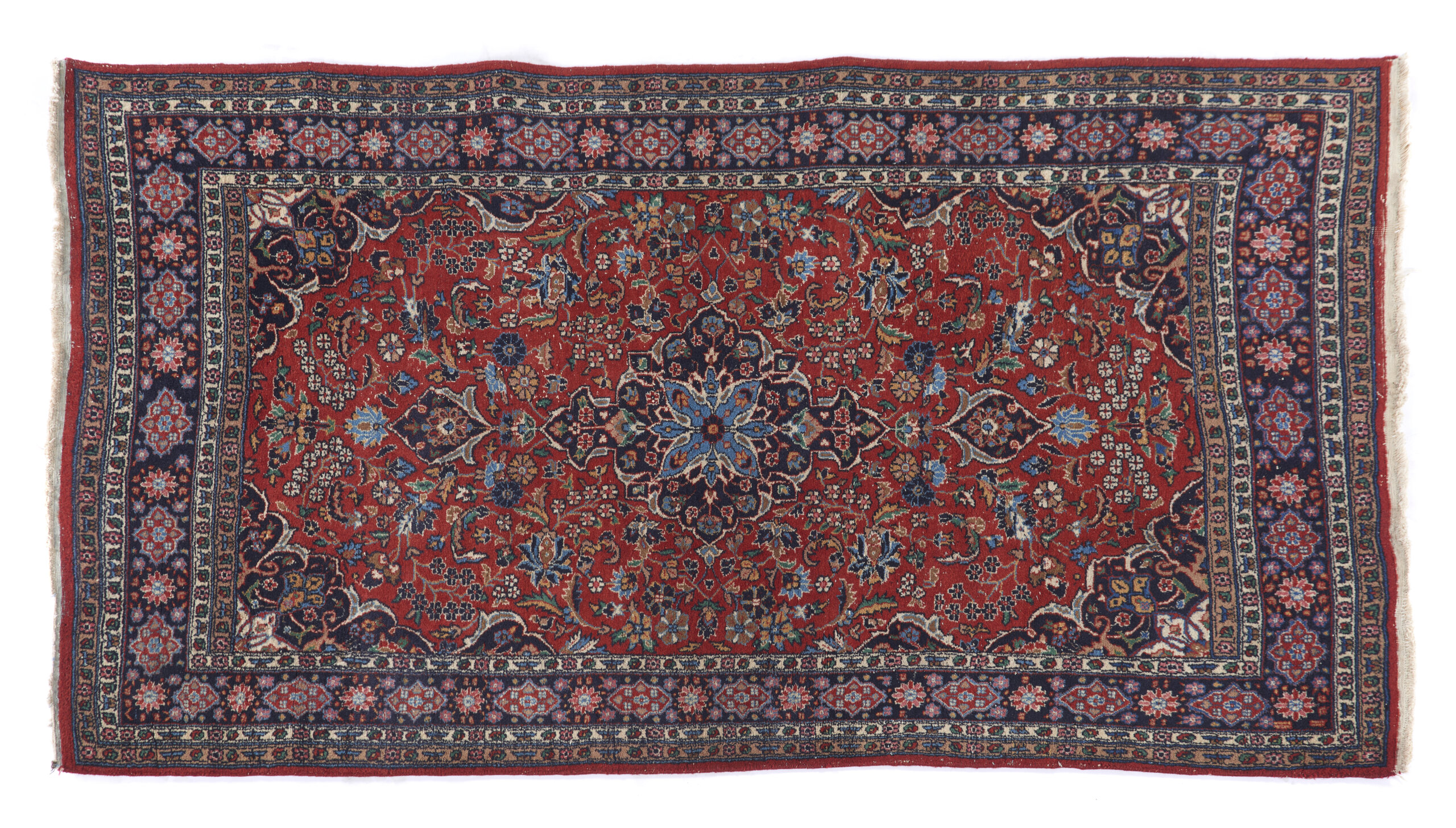 Wool and cotton, with red field decorated with interlaced foliage, palmettes and stylised flowers in shades of light blue, ivory, green and pink, articulated with a lobed medallion in dark blue, filled with stylised flowers
