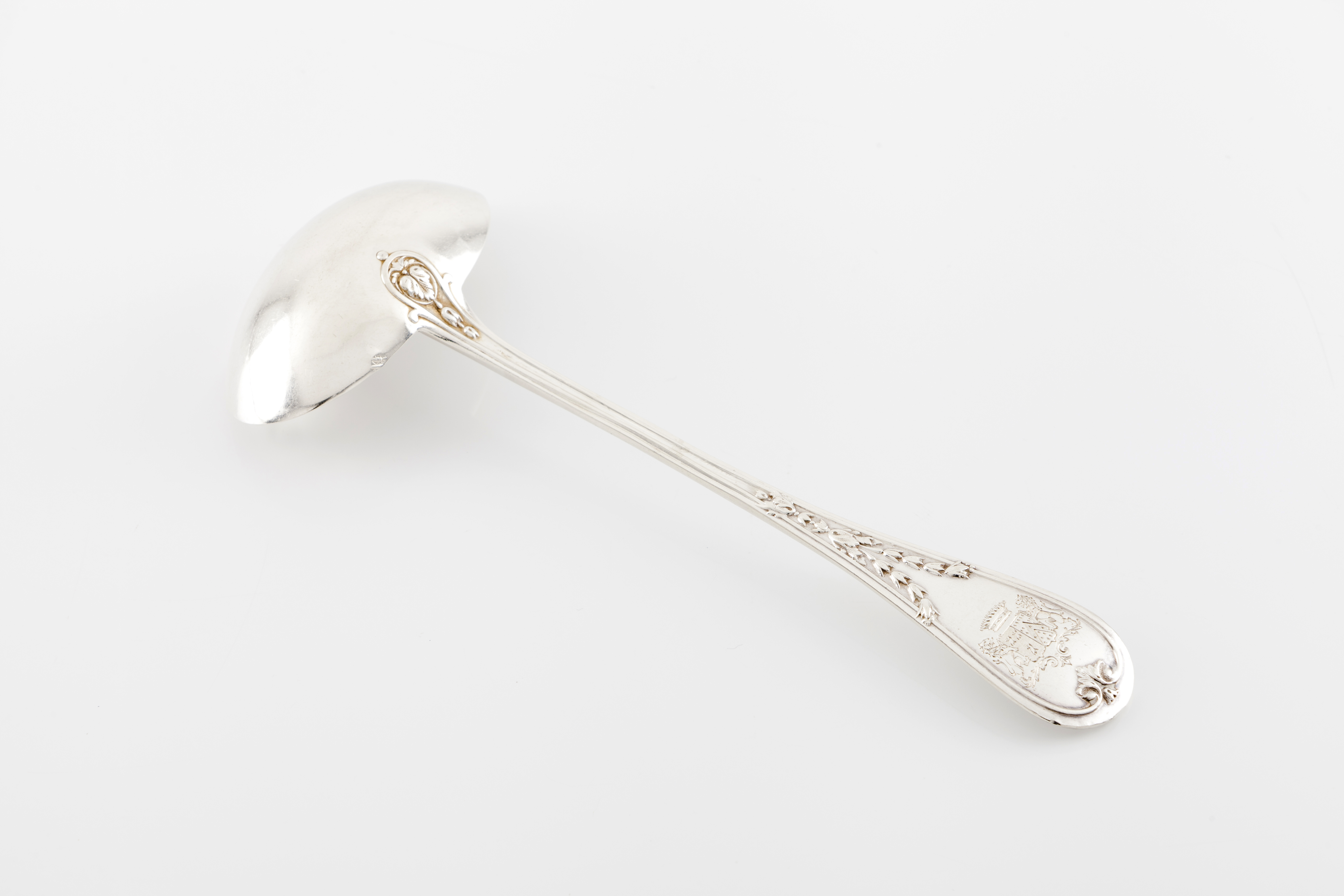 French silver of foliage filets the cup engraved with marriage heraldic shield toped by count's coronet, marked "Minerve 1er Titre"