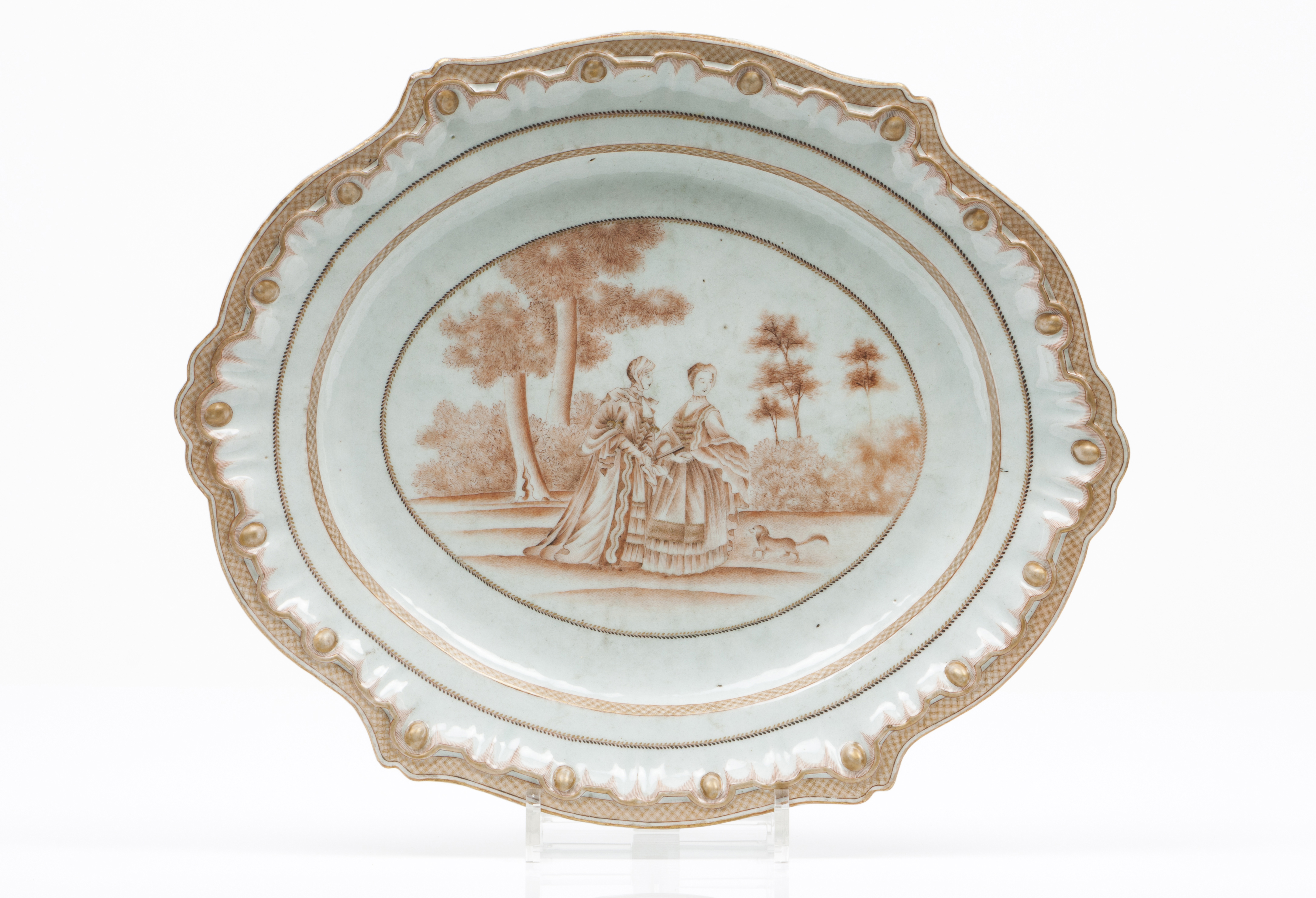 Chinese export porcelain, Sepia and gilt Decoration depicting European Female Figures with Dog