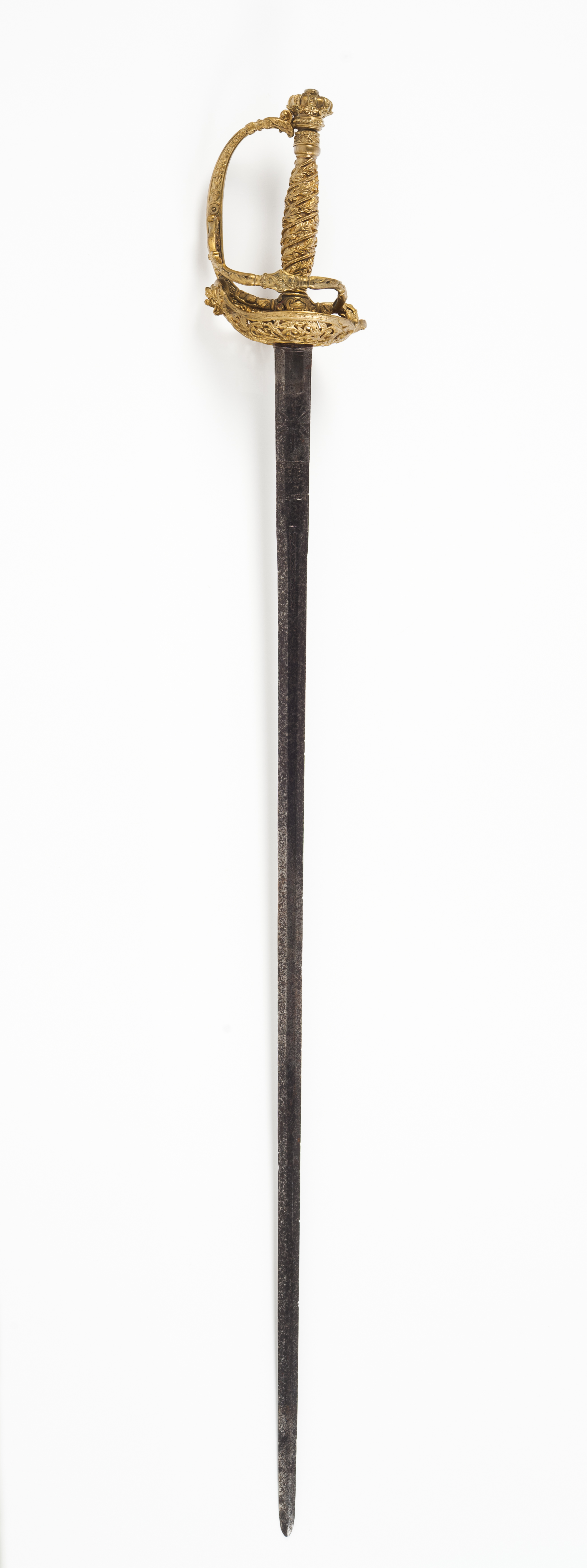 Engraved straight double edged blade inscribed "Si fortune me tourmente" on one side, and "L'esperance me contente" on the other