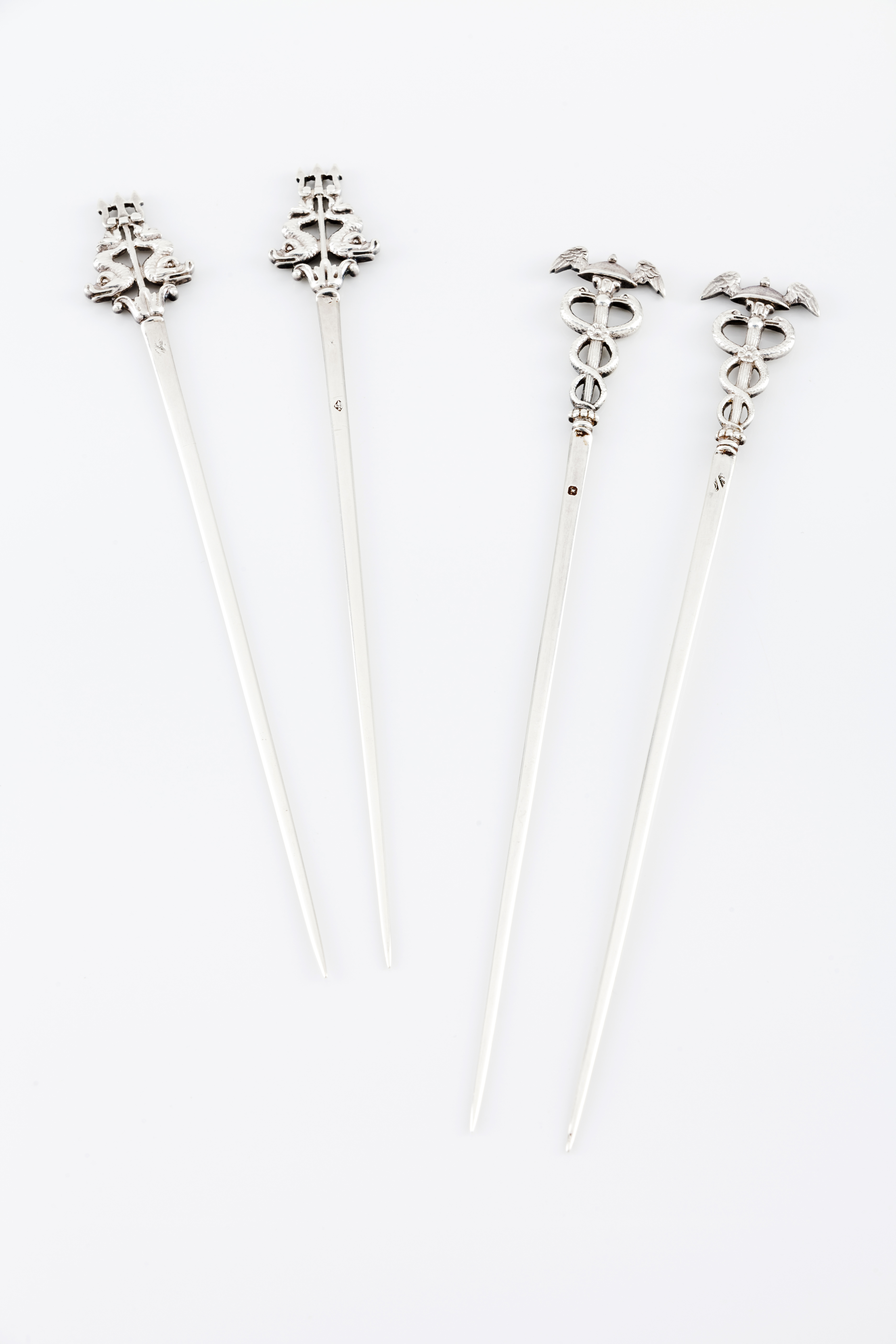 Caduceus and Mercury's helmet on a gadrooned ground decoration on two skewers and dolphins and Poseidon trident on an acanthus ground for the other two skewers