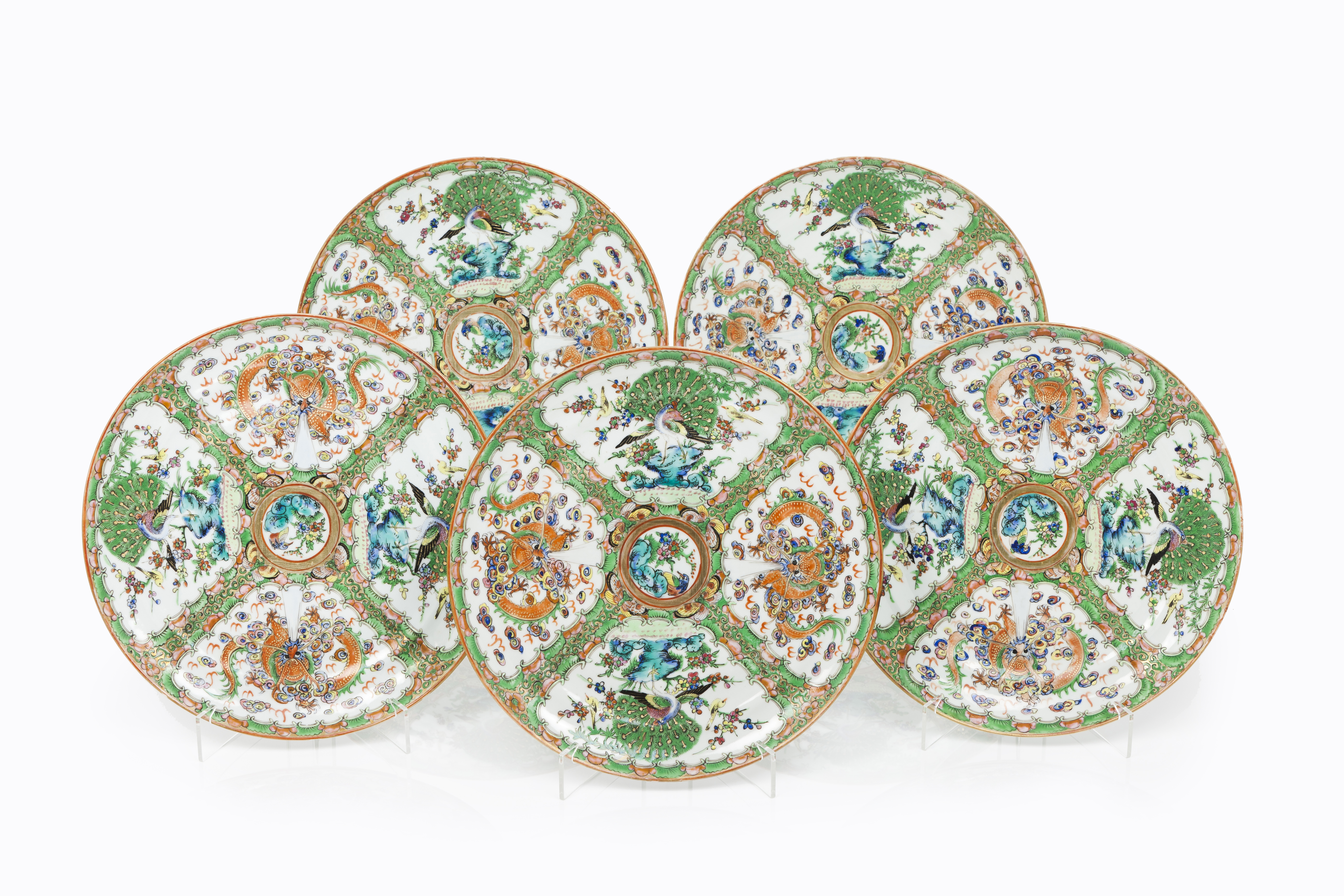 Porcelain, scalloped lip of 4 alternating cartouche decoration with dragon, flowers and clouds, and peacock, rocks, flowers, foliage and birds enhanced with gold. Marked Made in China