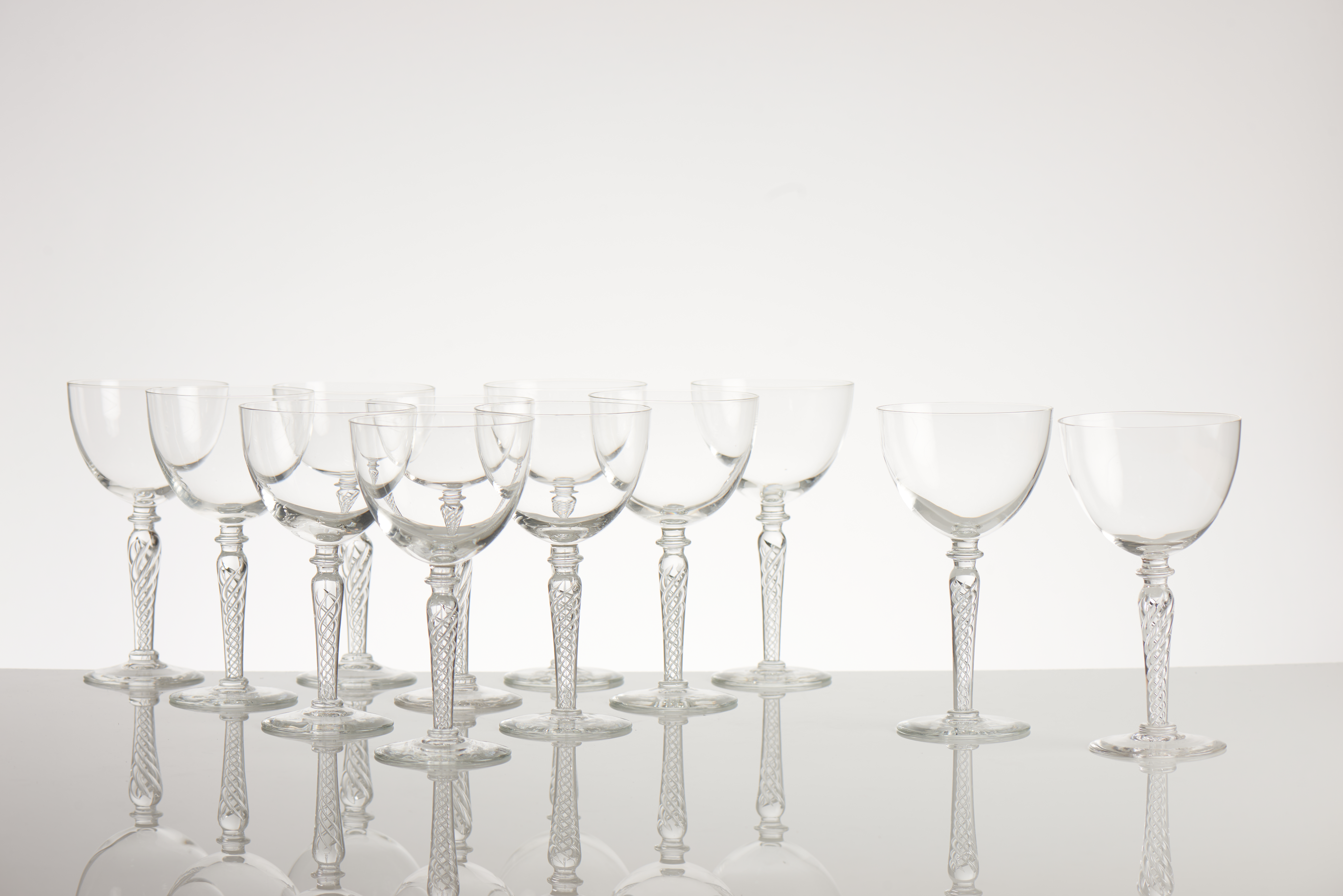 Tall footed crystal, comprising of 12 white wine glasses (h.18 cm), 12 red wine glasses (h15,8 cm) and 12 Rhine wine glasses with violet coloured cup and foot (h.18,5 cm)