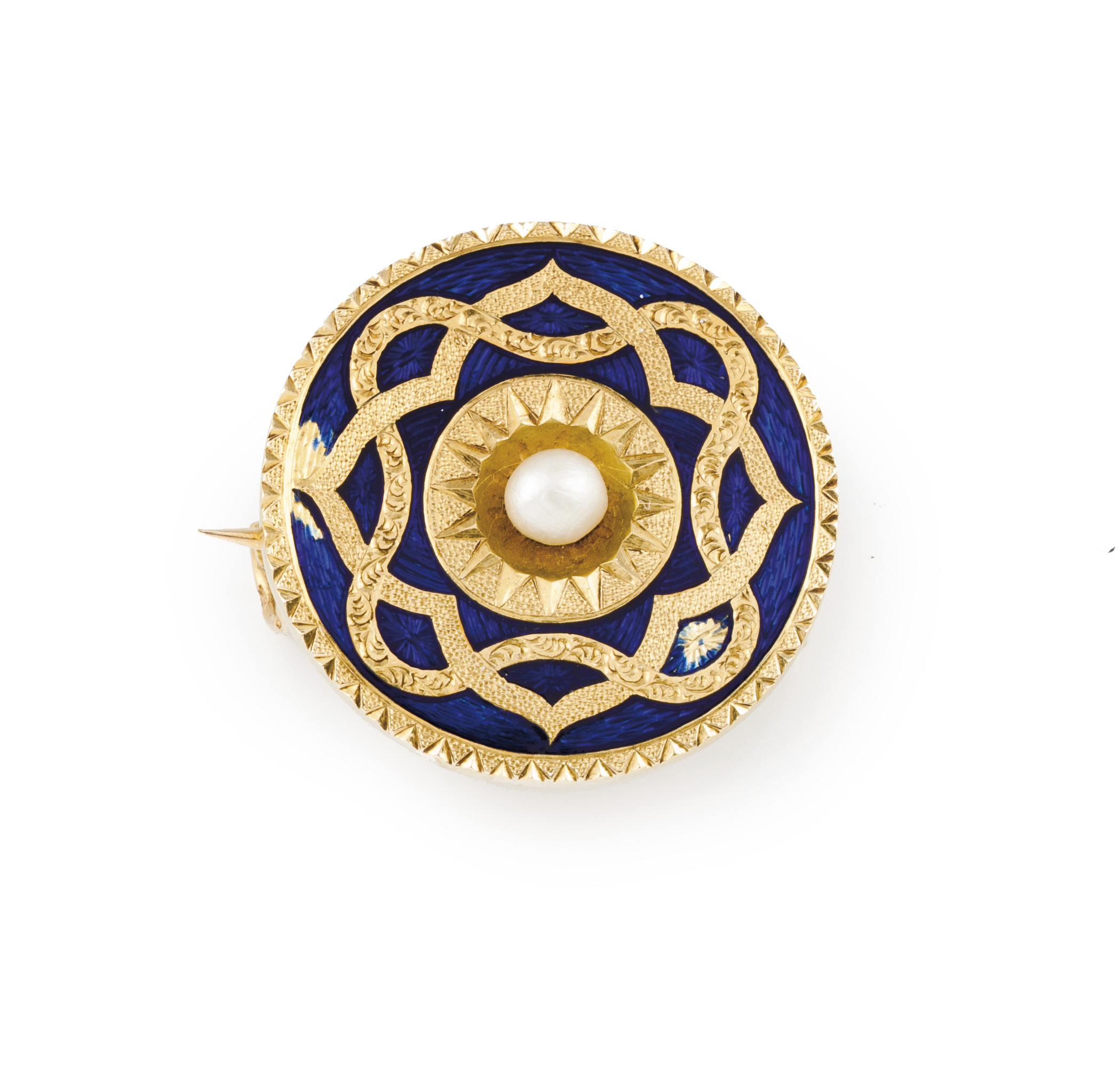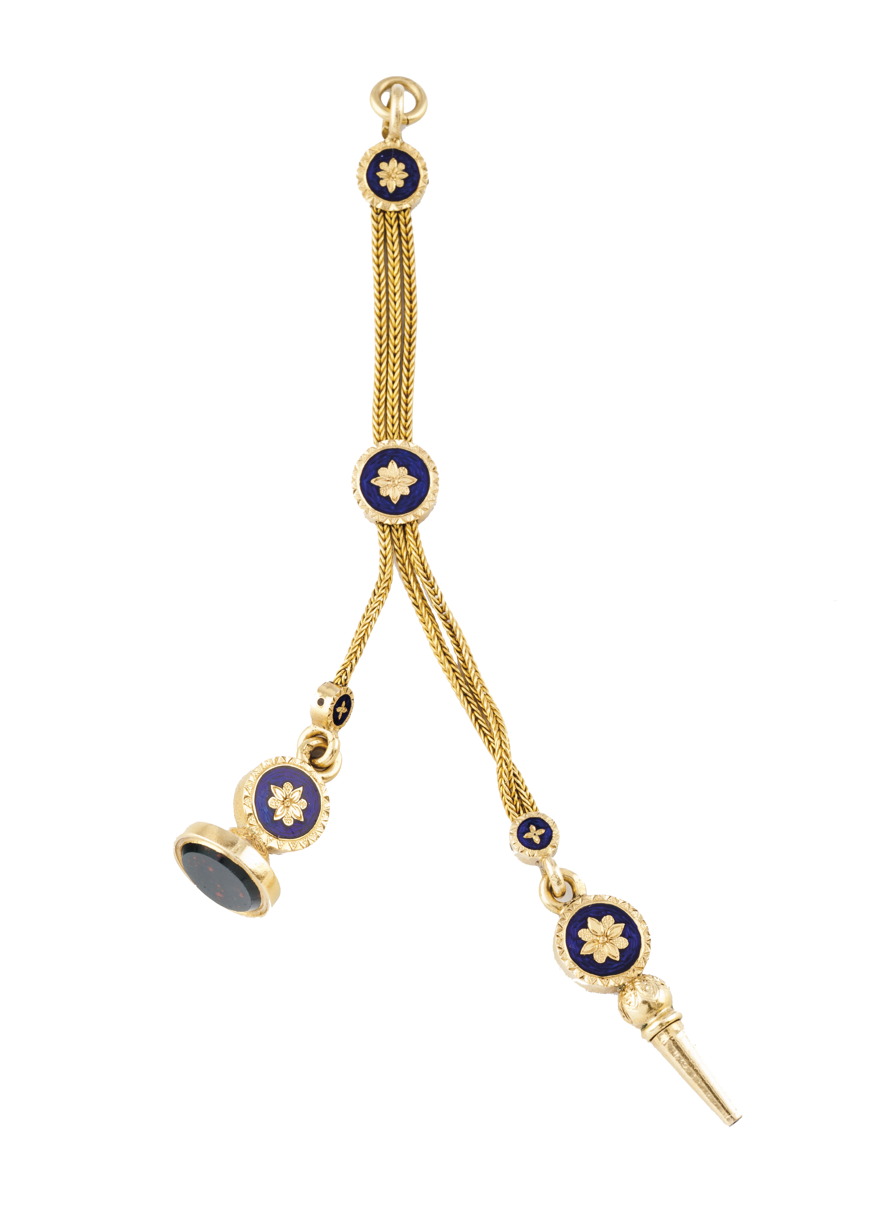 Pin of identical decoration and fish bone mesh chatelaine's pendant with chiselled and blue enamelled elements with suspended watch winding key and wax seal