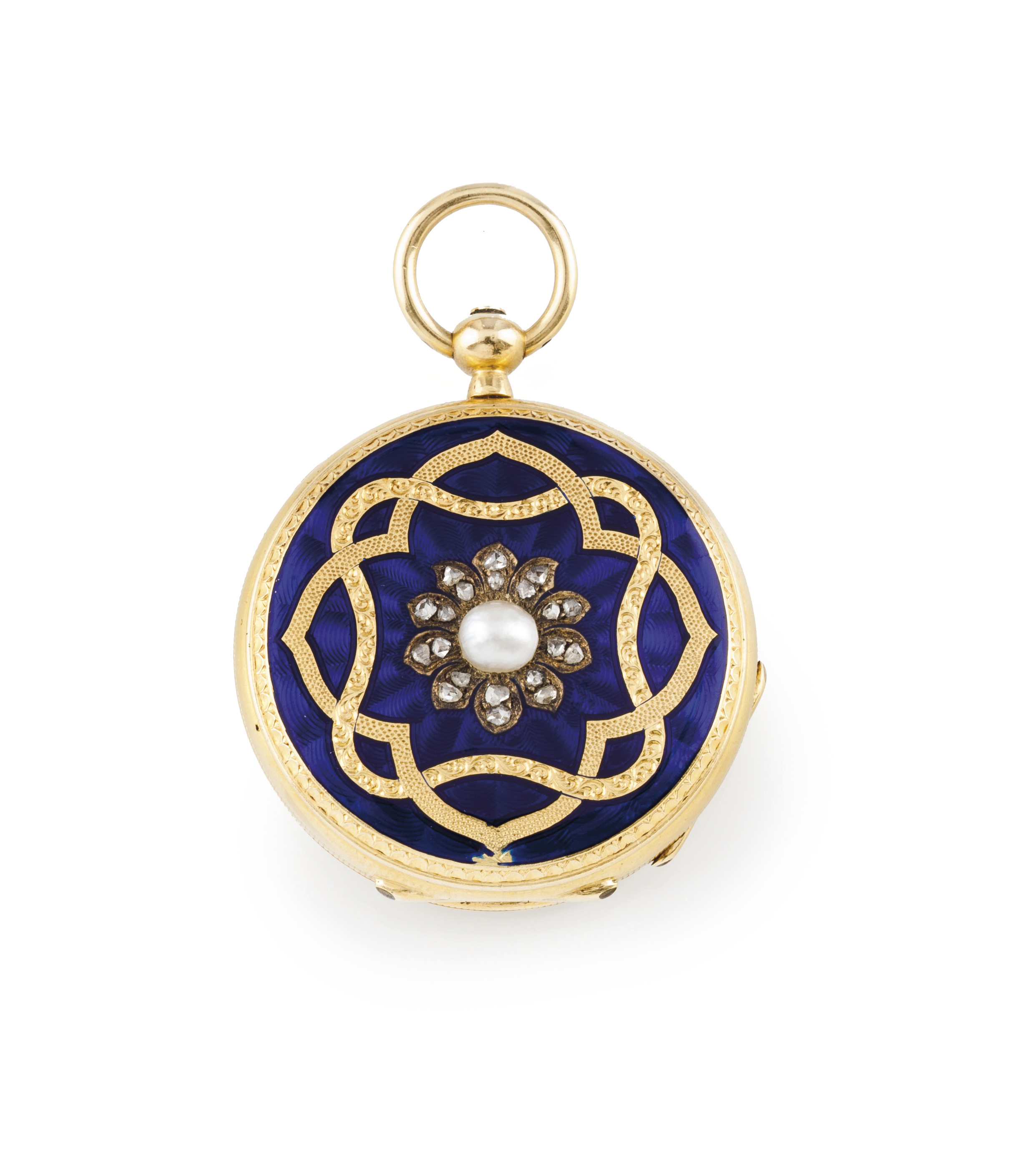 Blue enamelled back of ribbons decoration set with pearl and rose cut diamonds