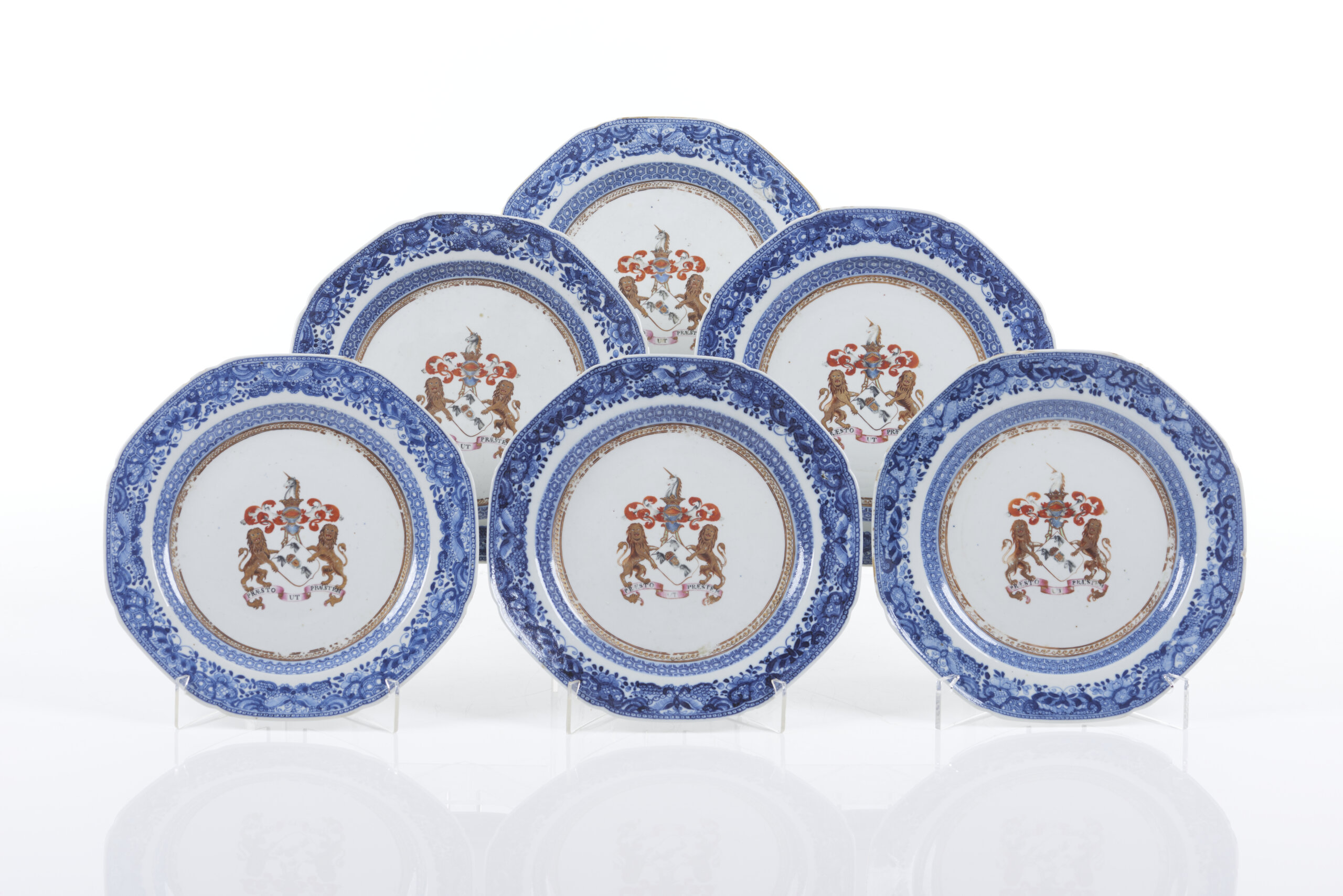 Decorated with Famille Rose enamels, underglaze blue and gilt, the centres bearing the arms of the Preston family of Valleyfield House, Scotland, with the motto "Praesto Ut Praestem"