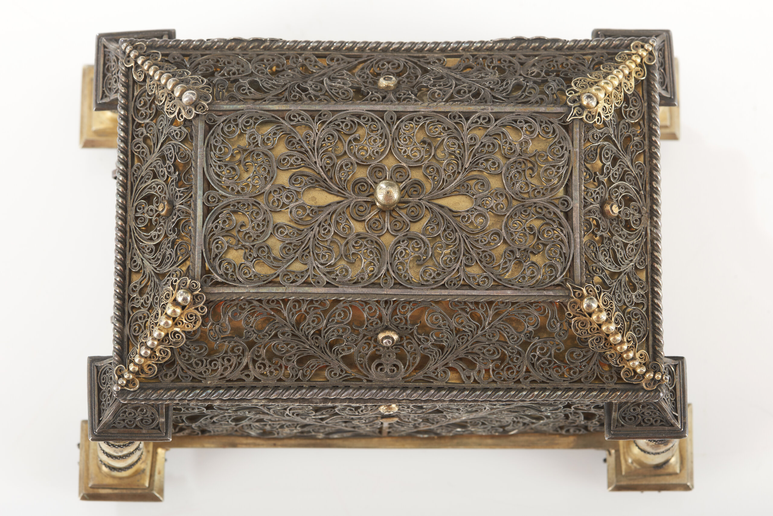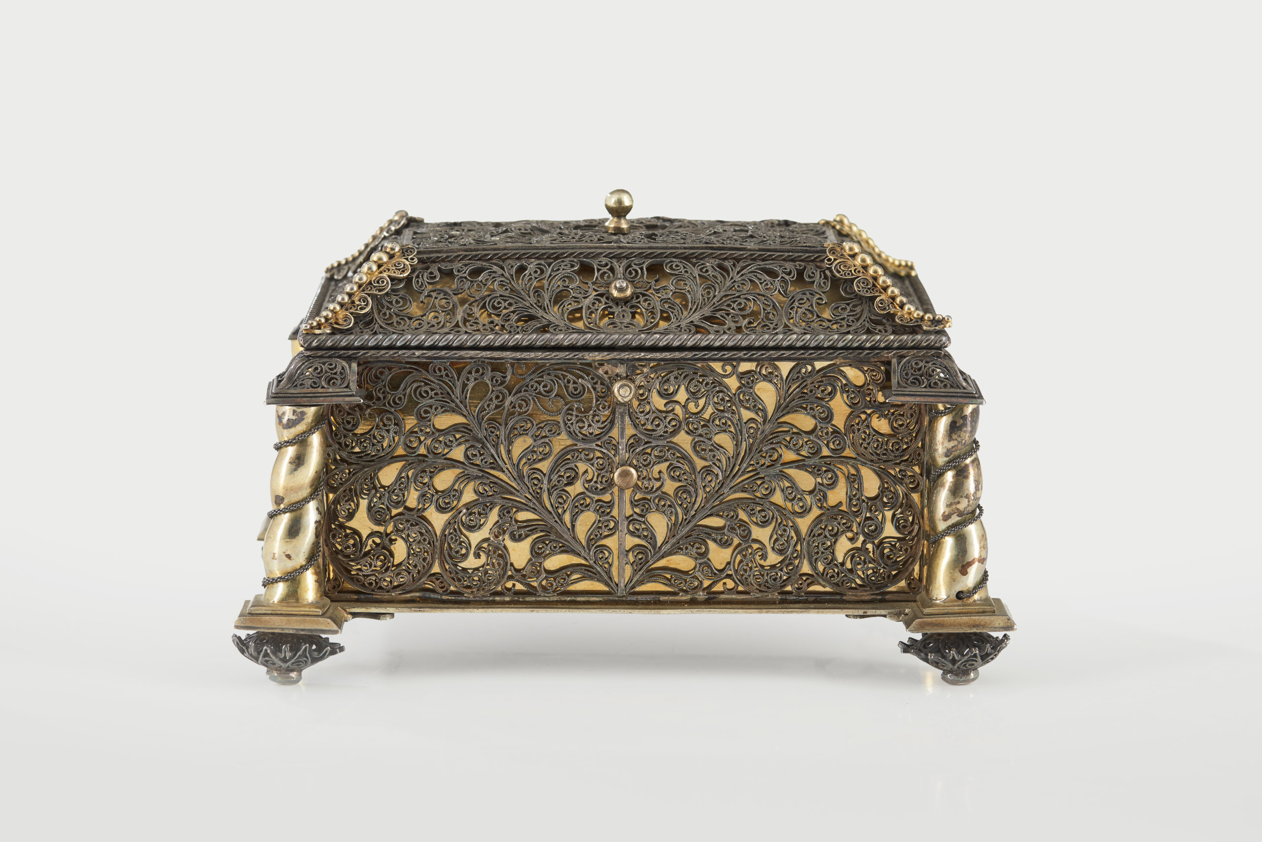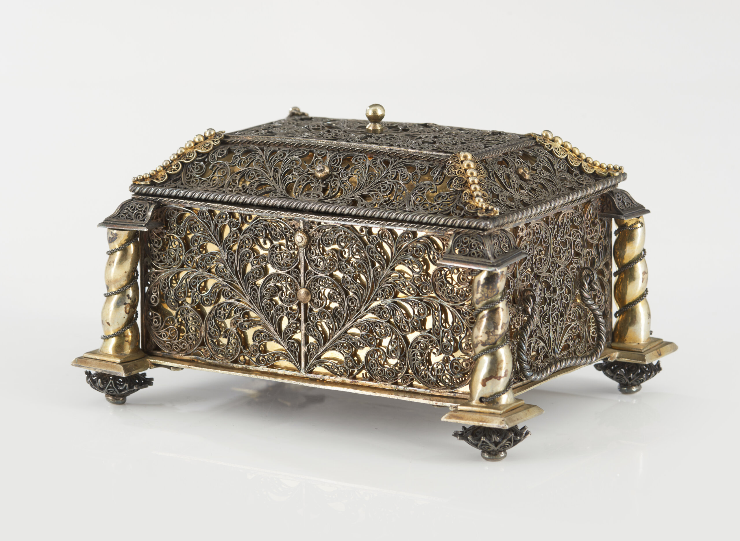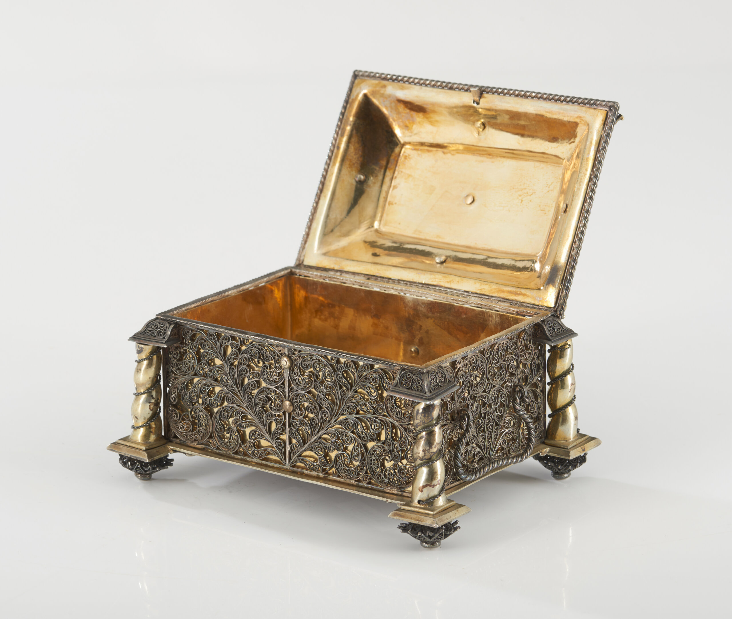 Rectangular form, corners with spiral columns and truncated pyramidal lid