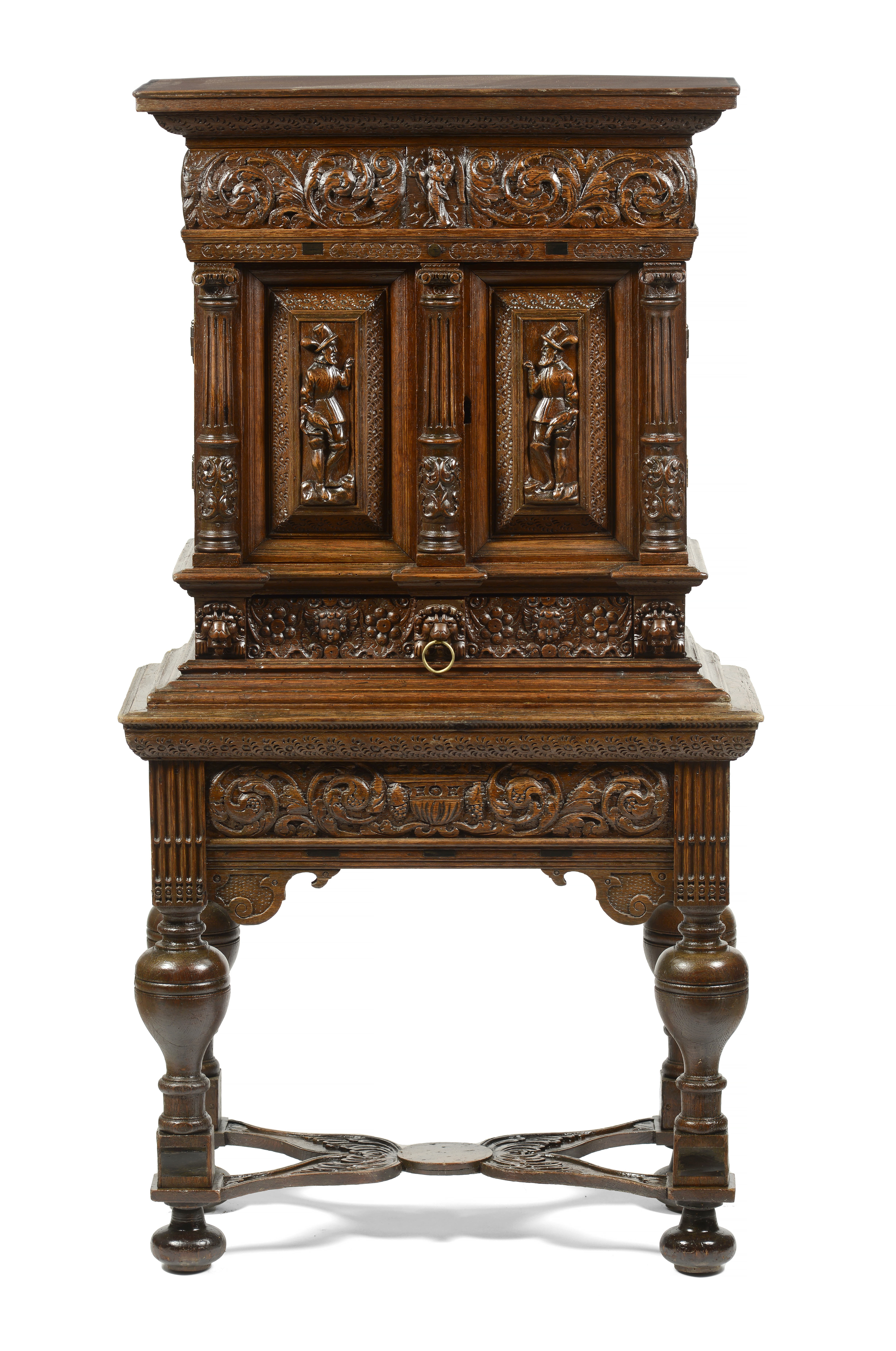 Cushioned doors depicting 17th century figures, flanked by Doric columns