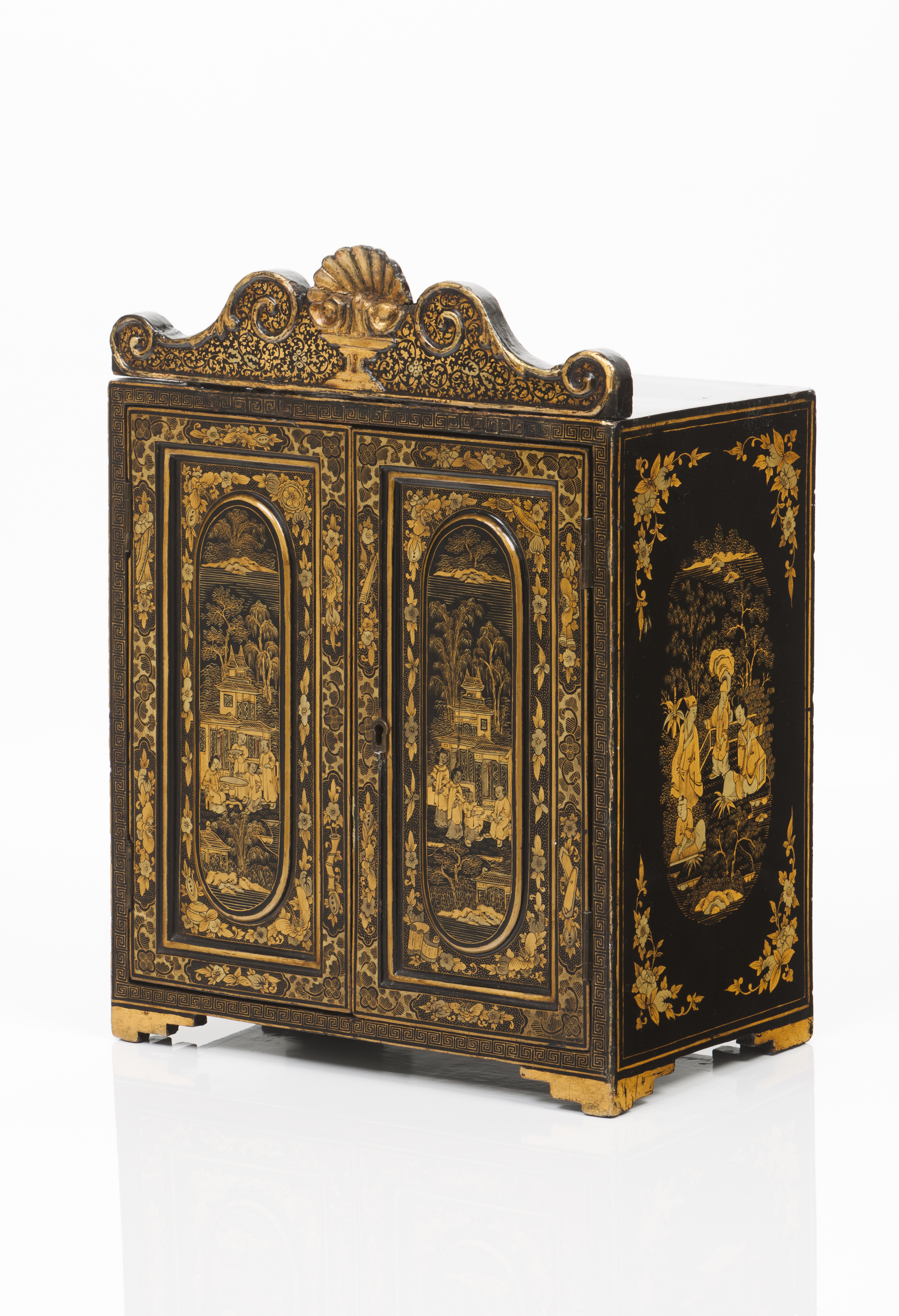 Two doors of foliage motifs, butterflies, precious objects and landscapes with pavilions and figures decoration