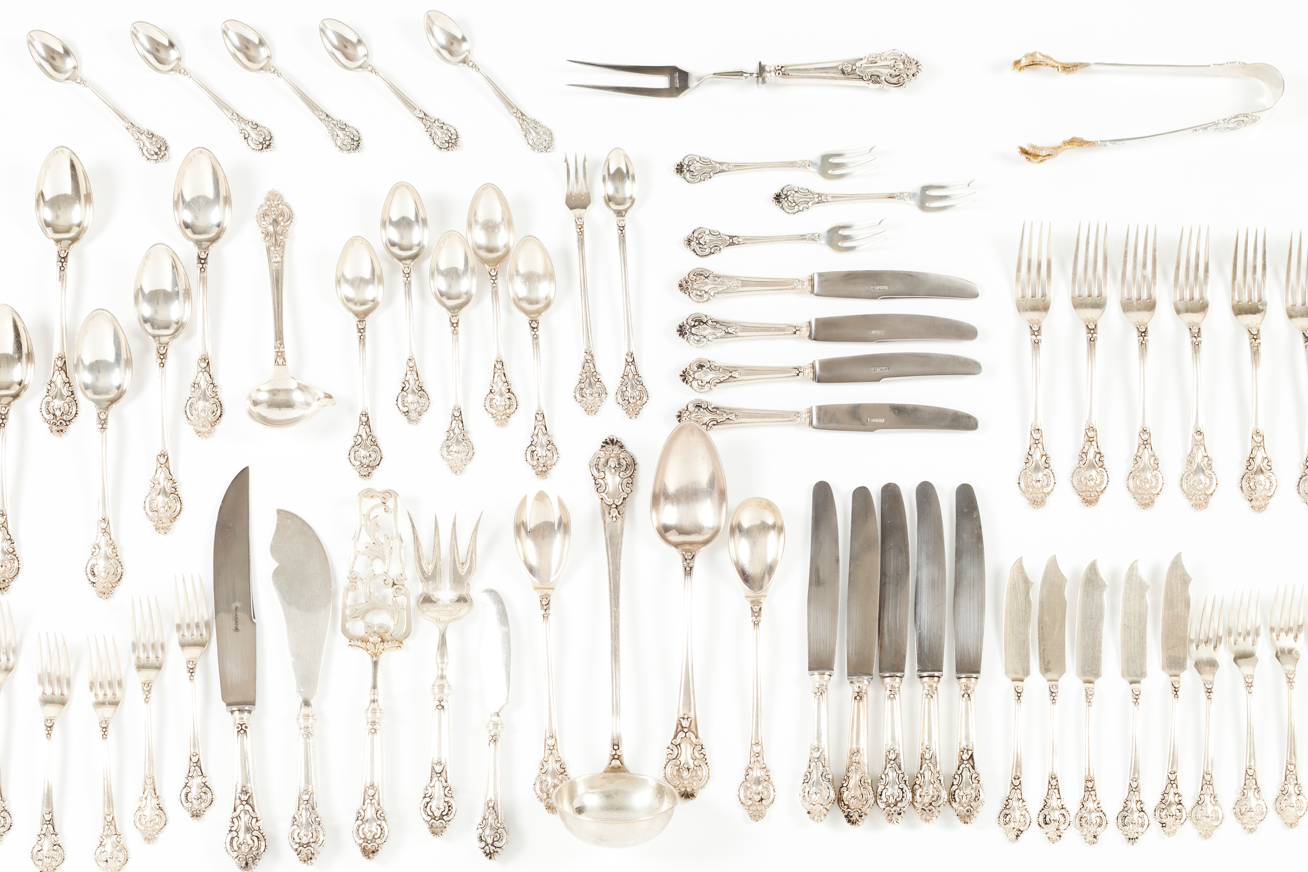 Comprising: 20 serving pieces, 12 soup spoons, 12 table forks, 12 table knives, 12 fish forks, 12 fish knives, 12 dessert spoons, 12 dessert forks, 12 dessert knives, 12 cake forks, 12 tea spoons and 12 coffee spoons