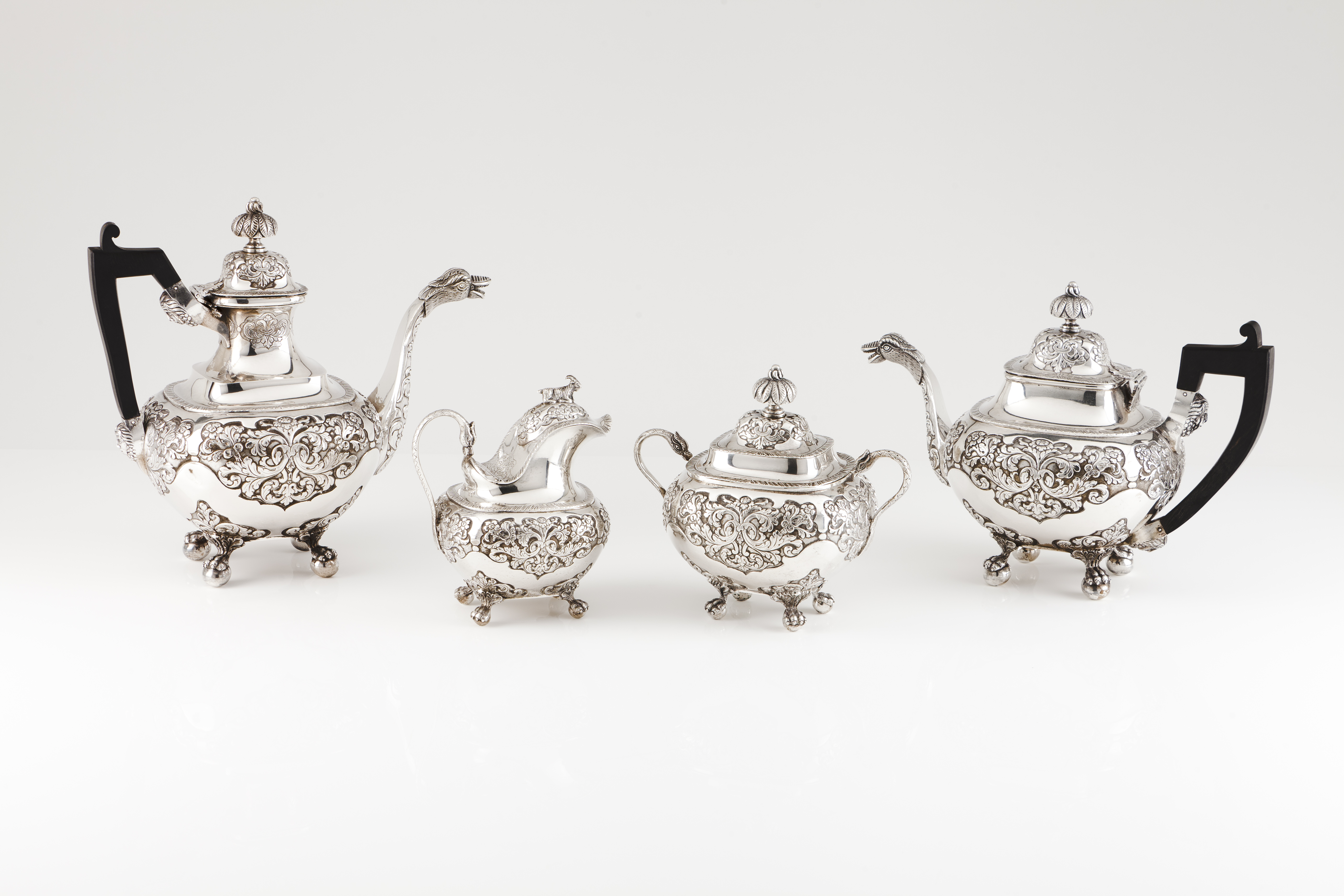Profuse raised and engraved decoration of foliage motifs and gadrooned friezes, swan neck spout of identical decoration and fantastic animal finial
