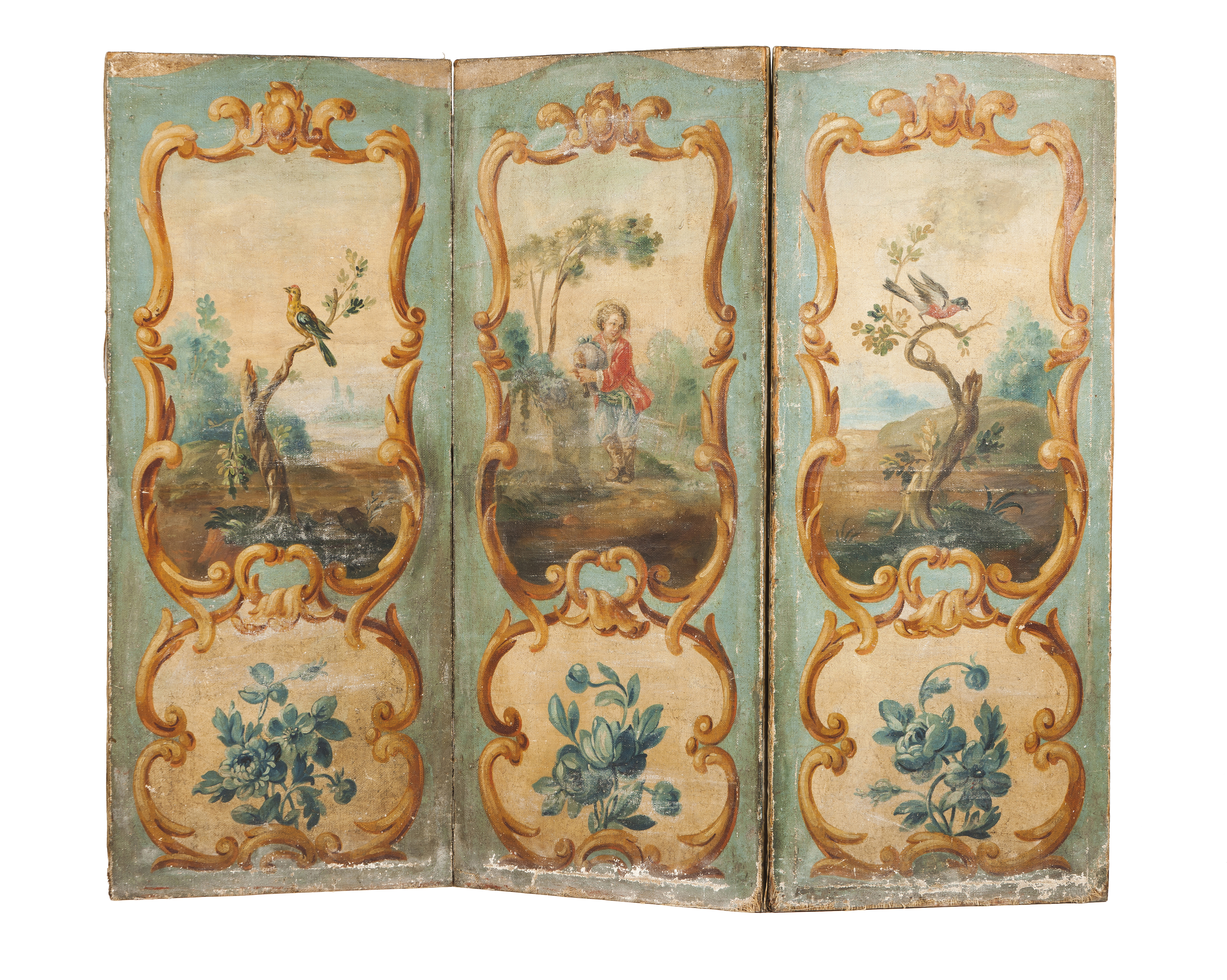 Cartouche decoration of landscapes with birds, putto and flowers