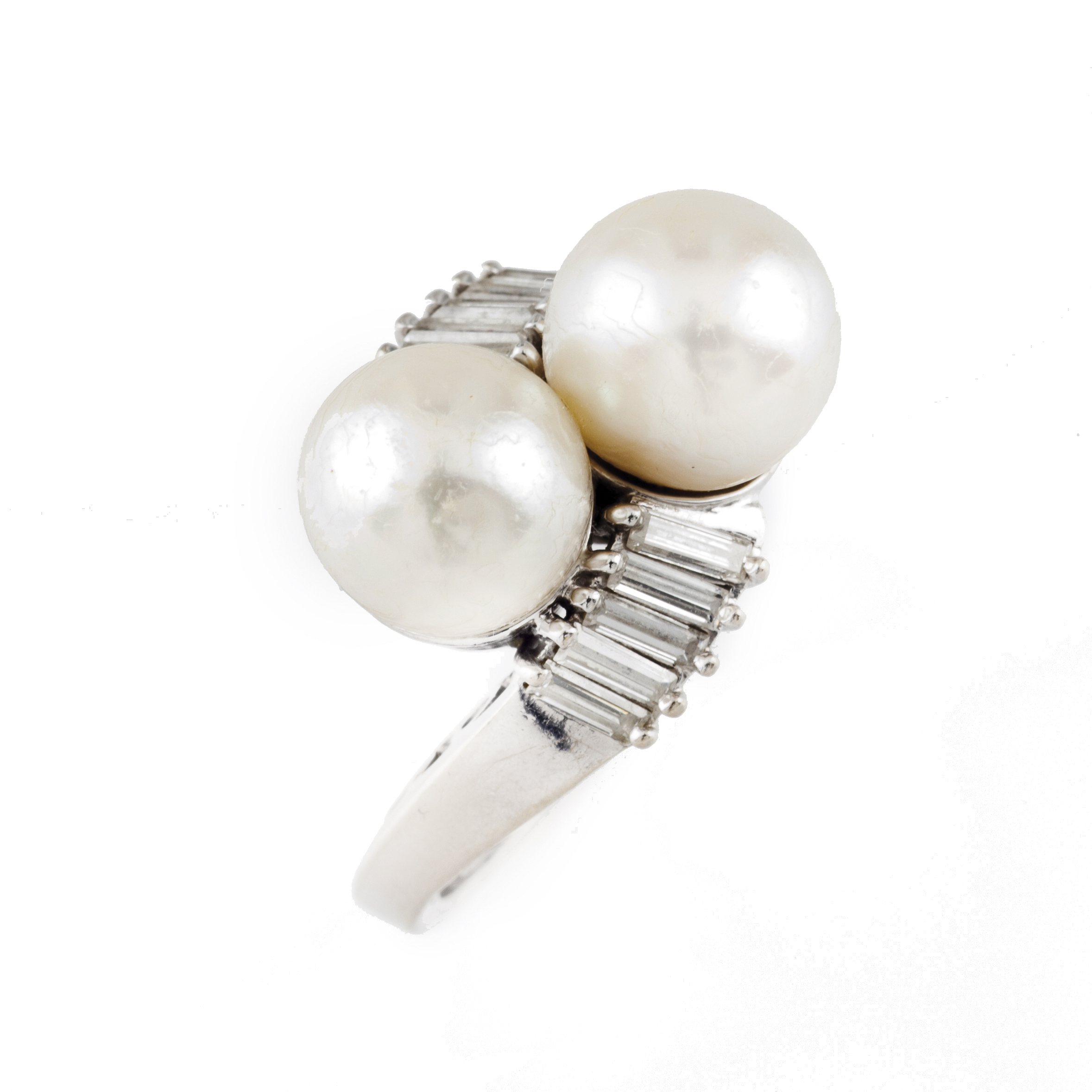 Set with two cultured pearls (ca. 8.5 mm) and 10 baguette cut diamonds (ca. 0.50ct)