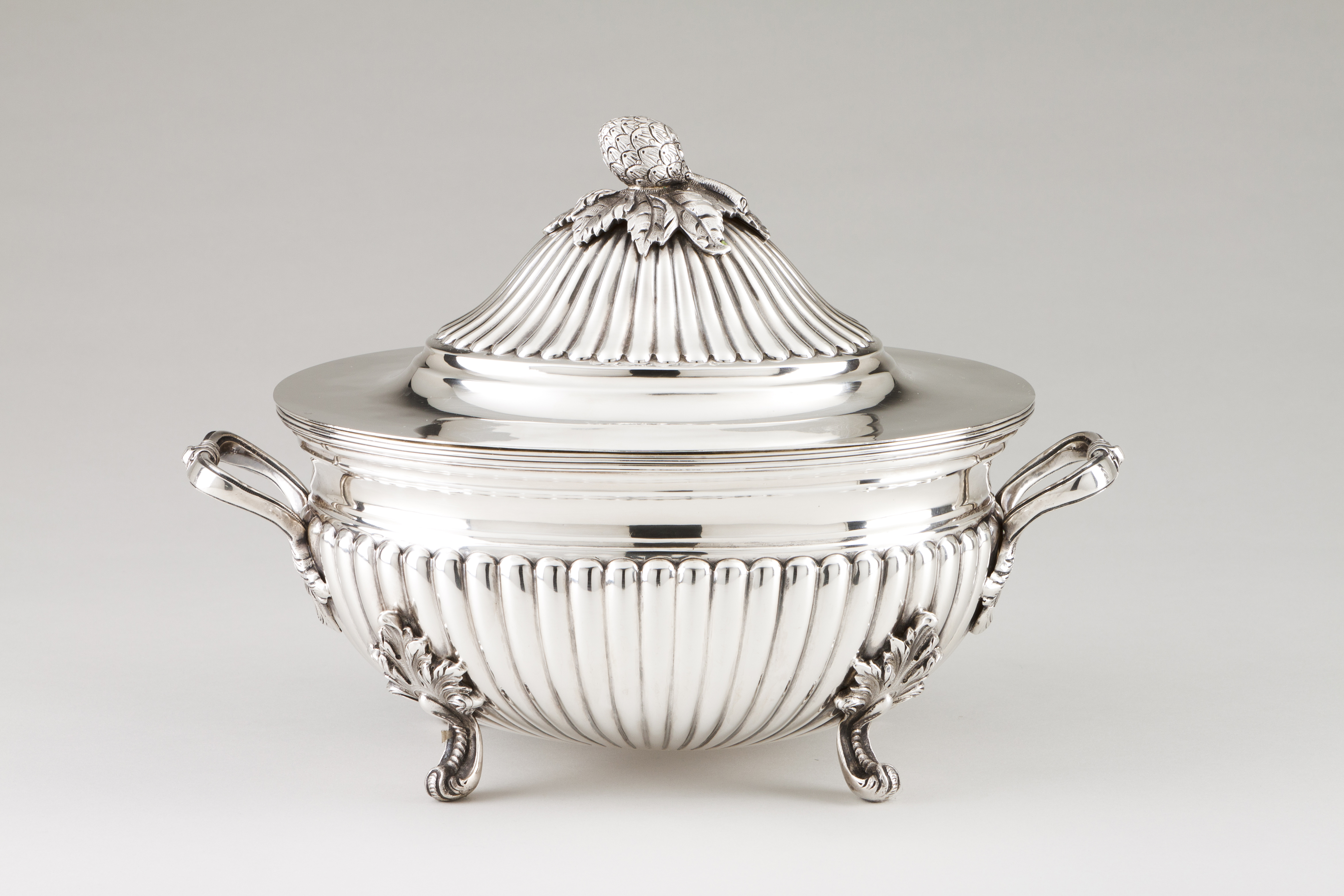 Feet and handles of foliage detail at the union with the body and fruit and foliage lid pommel