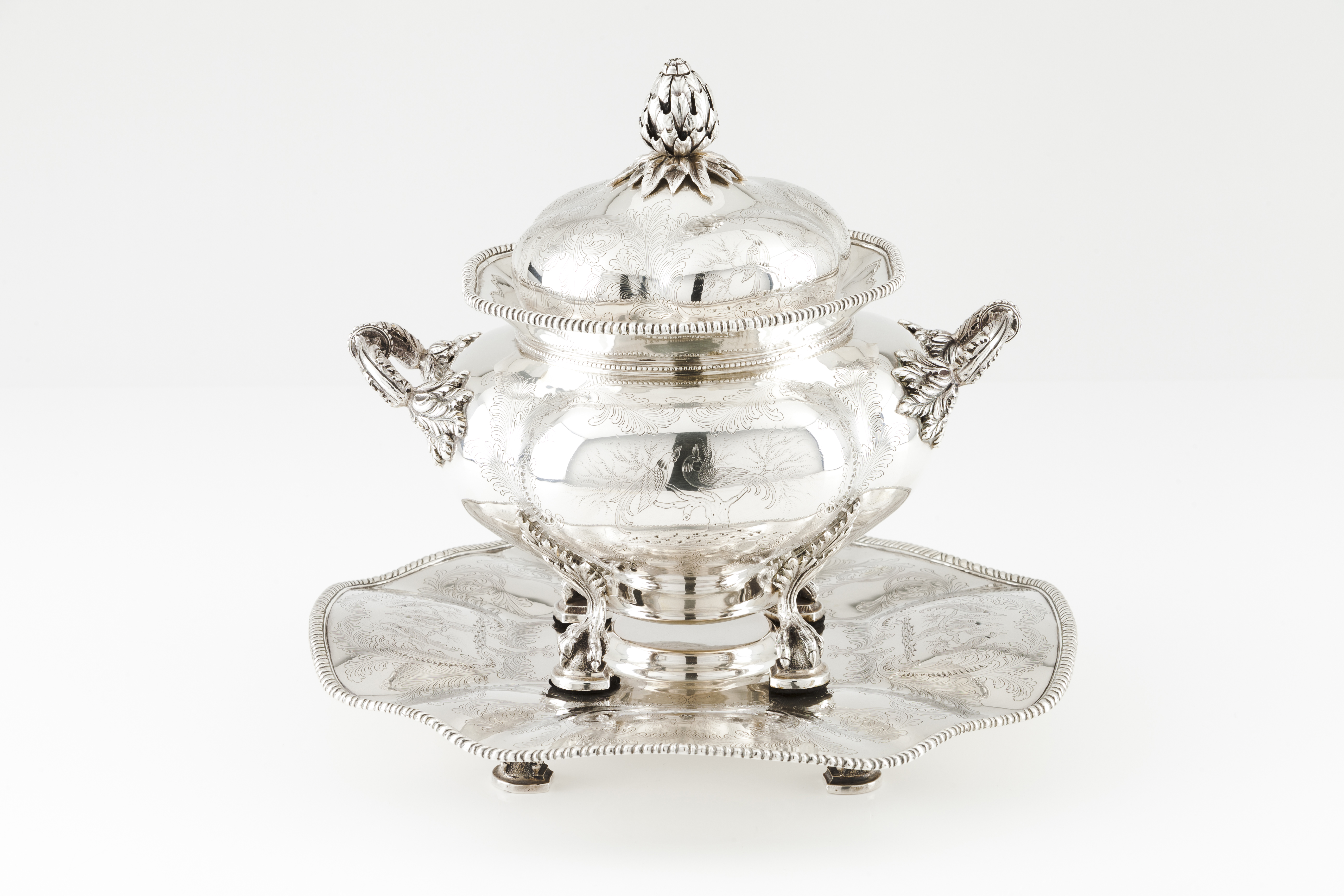 Moulded and gadrooned body of foliage and birds on trees engraved and chiselled decoration