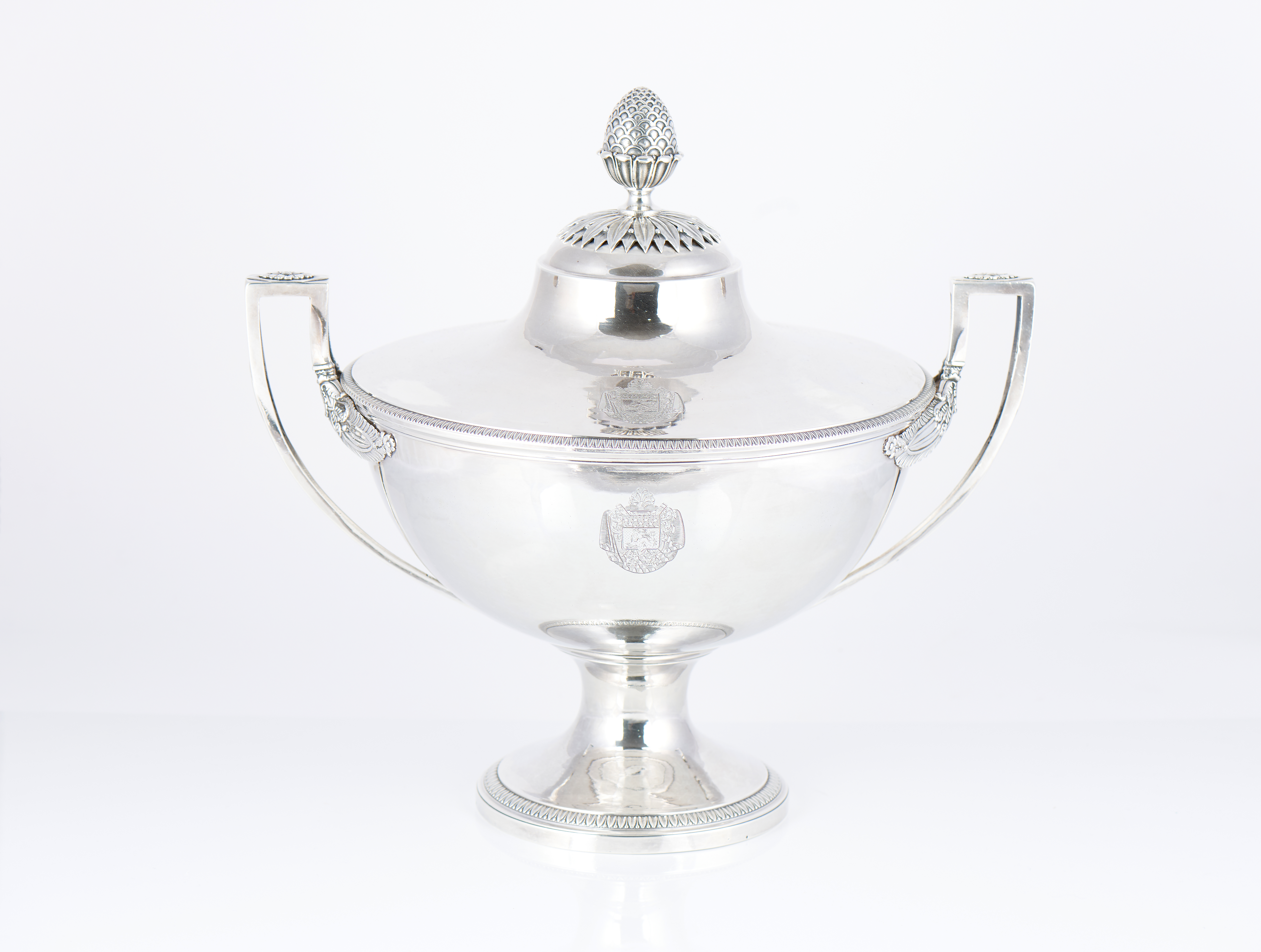 Large dish and cover with two handles of palm friezes and pine cone lid pommel