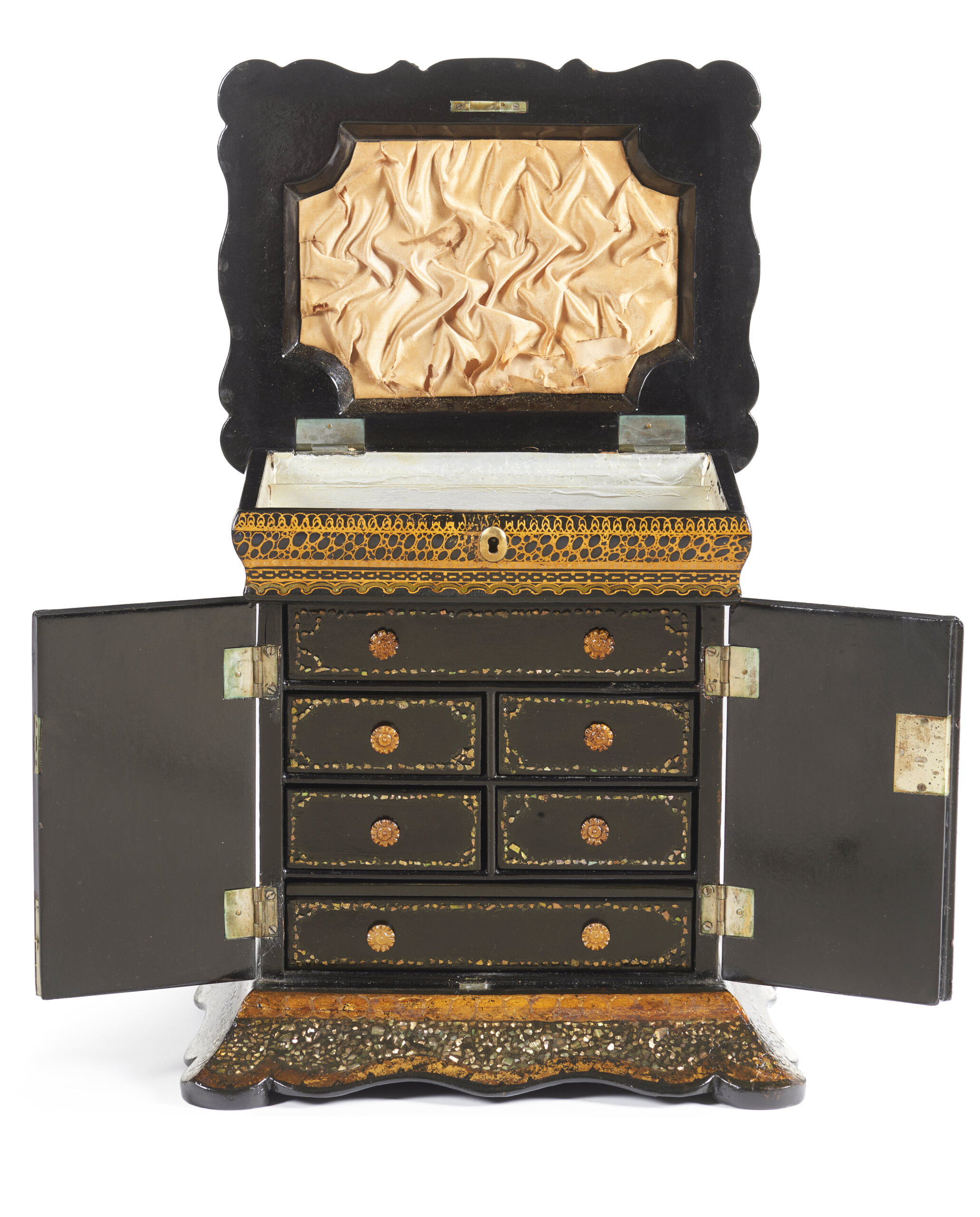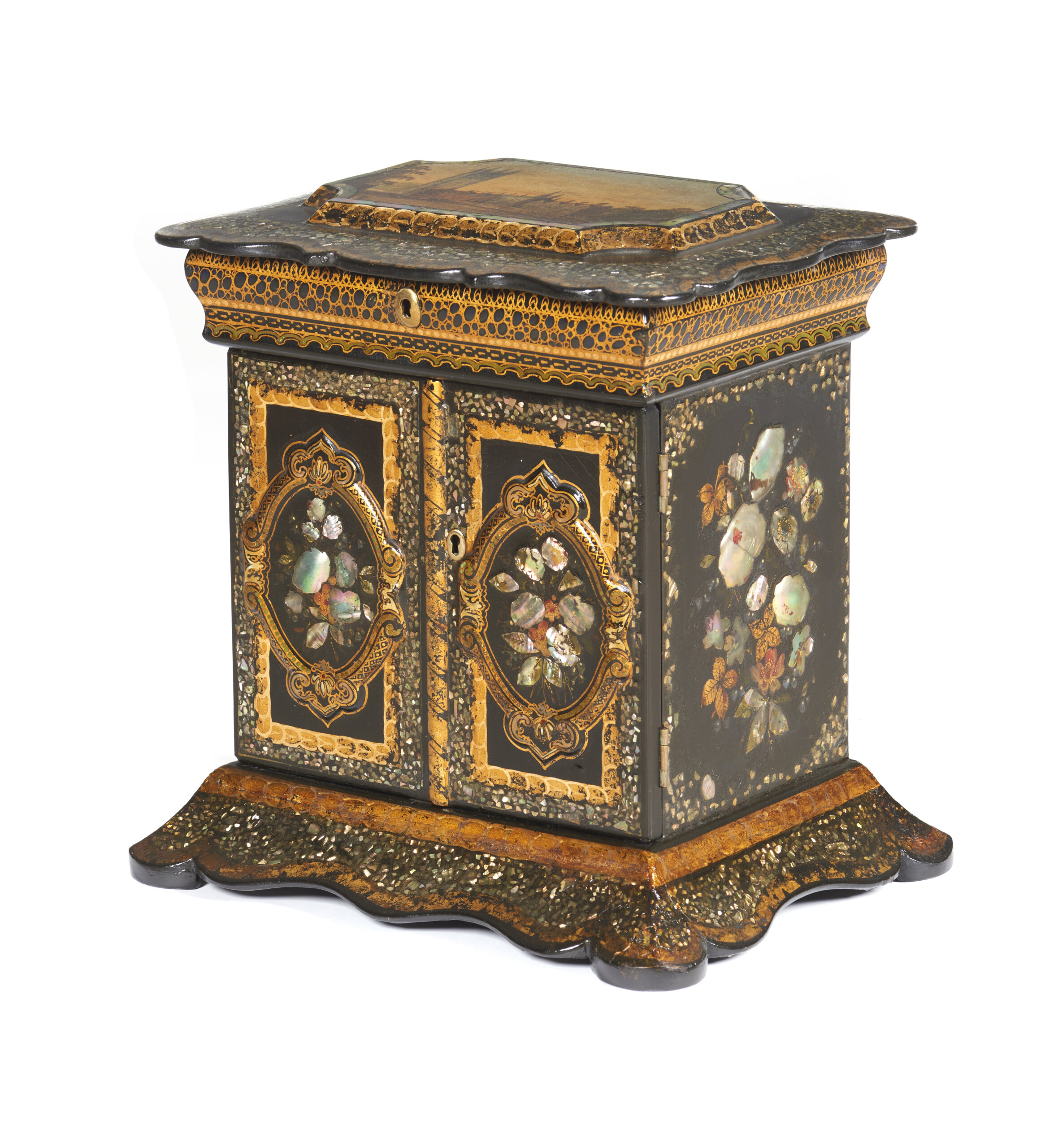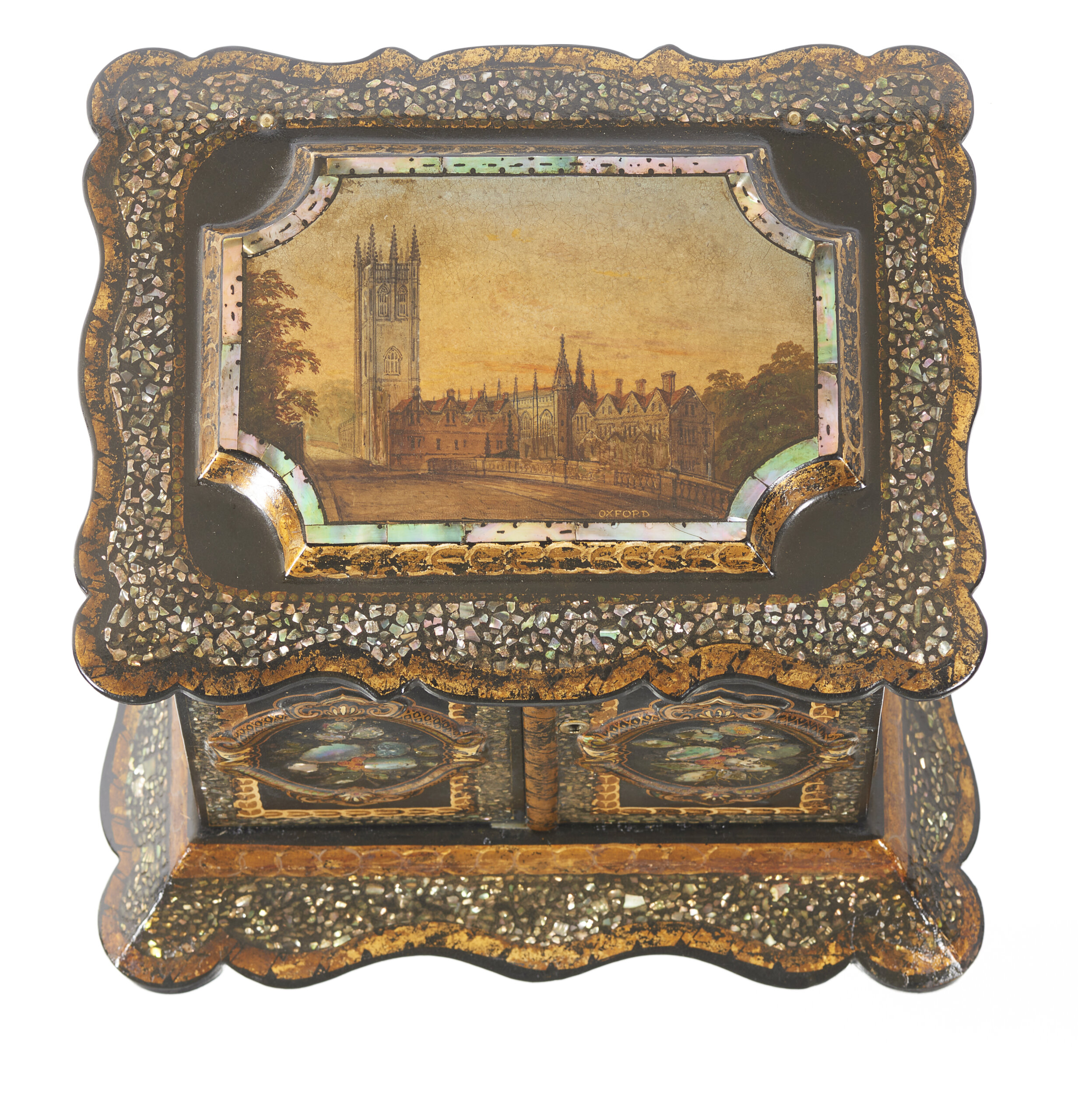 Polychrome and gilt decoration with mother-of-pearl inlay depicting a view of Oxford, flowers, scrollwork and friezes of various patterns