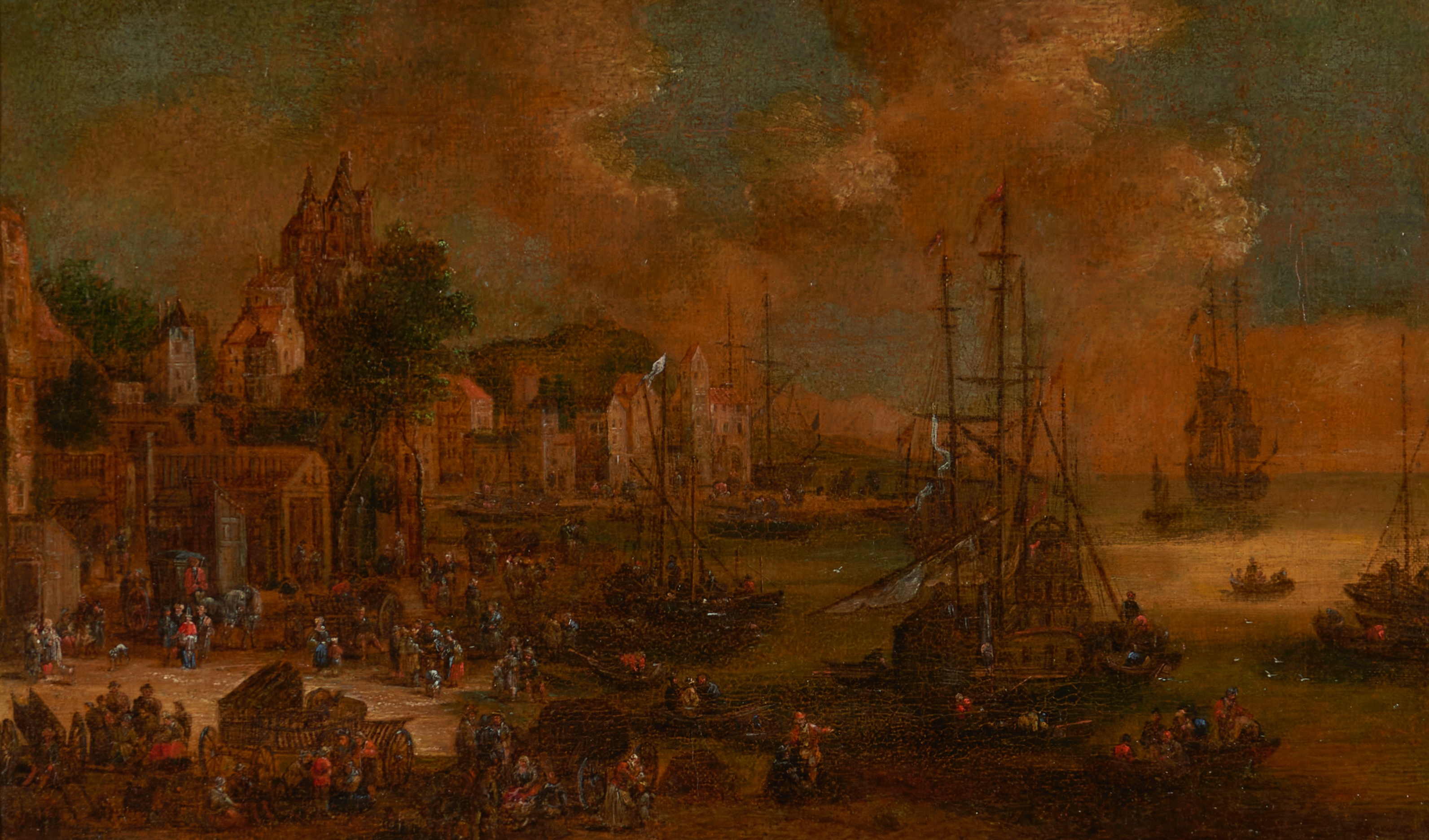 A view of a port with boats, buildings and figures