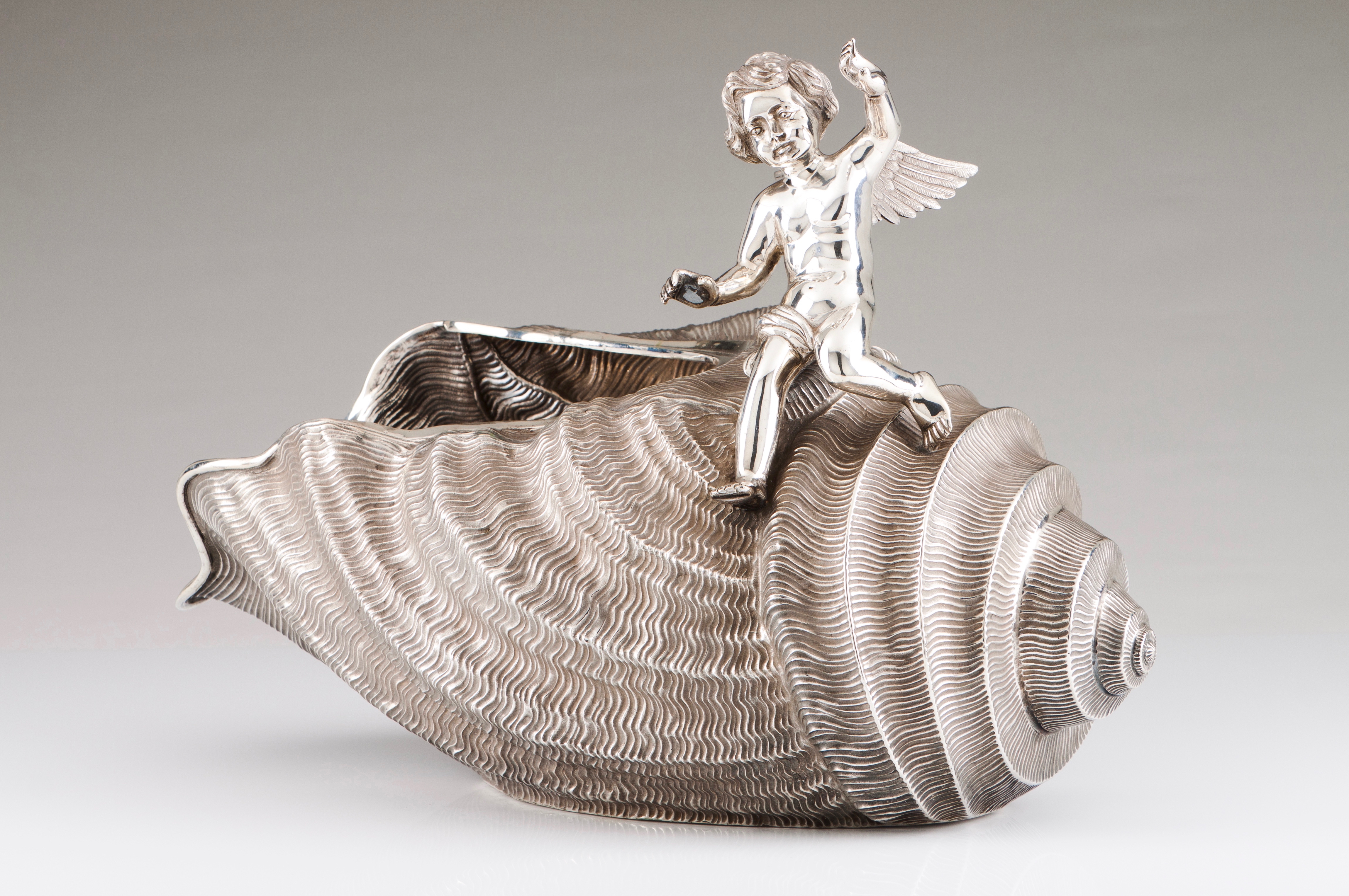 Decorated in relief and chiselled representing a large shell with a seated angel