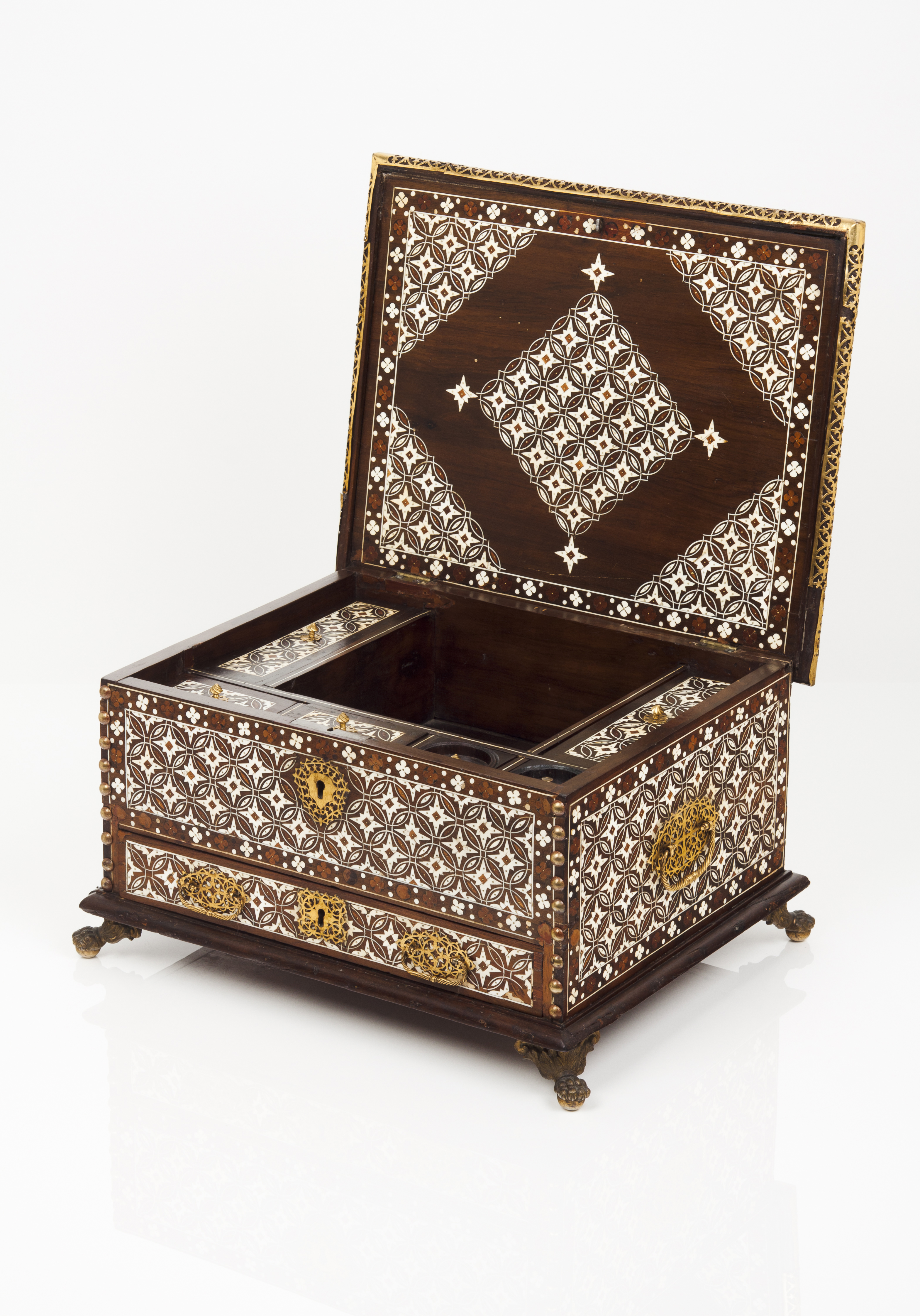 One drawer and hinged top cover with inner inkwell, sanding pot and other compartments