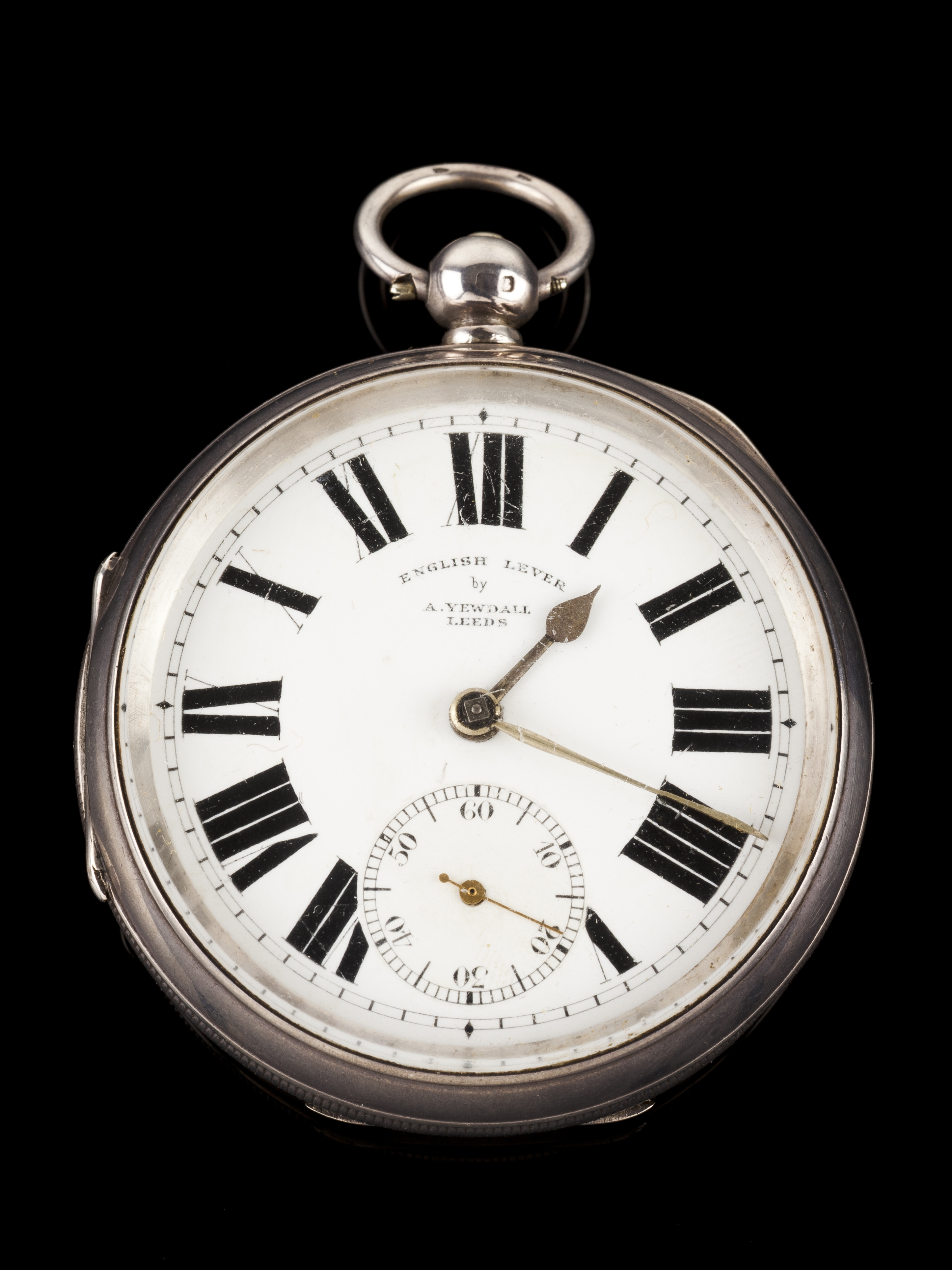 A "A. Yewdall Leeds" pocket watch with silver 56mm case. Mechanical movement. Ceramic dial. Missing key, not tested